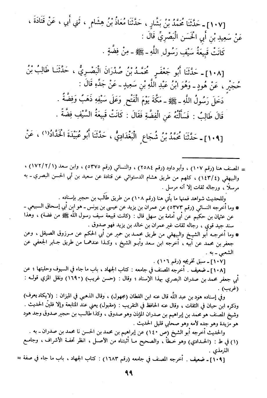 107 - حَدَّثَنَا مُحَمَّدُ بْنُ بَشَّارٍ قَالَ: حَدَّثَنَا مُعَاذُ بْنُ هِشَامٍ قَالَ: حَدَّثَنِي أَبِي، عَنْ قَتَادَةَ، عَنْ سَعِيدِ بْنِ أَبِي الْحَسَنِ قَالَ: «كَانَتْ §قَبِيعَةُ سَيْفِ رَسُولِ اللَّهِ صَلَّى اللهُ عَلَيْهِ وَسَلَّمَ مِنْ فِضَّةٍ»