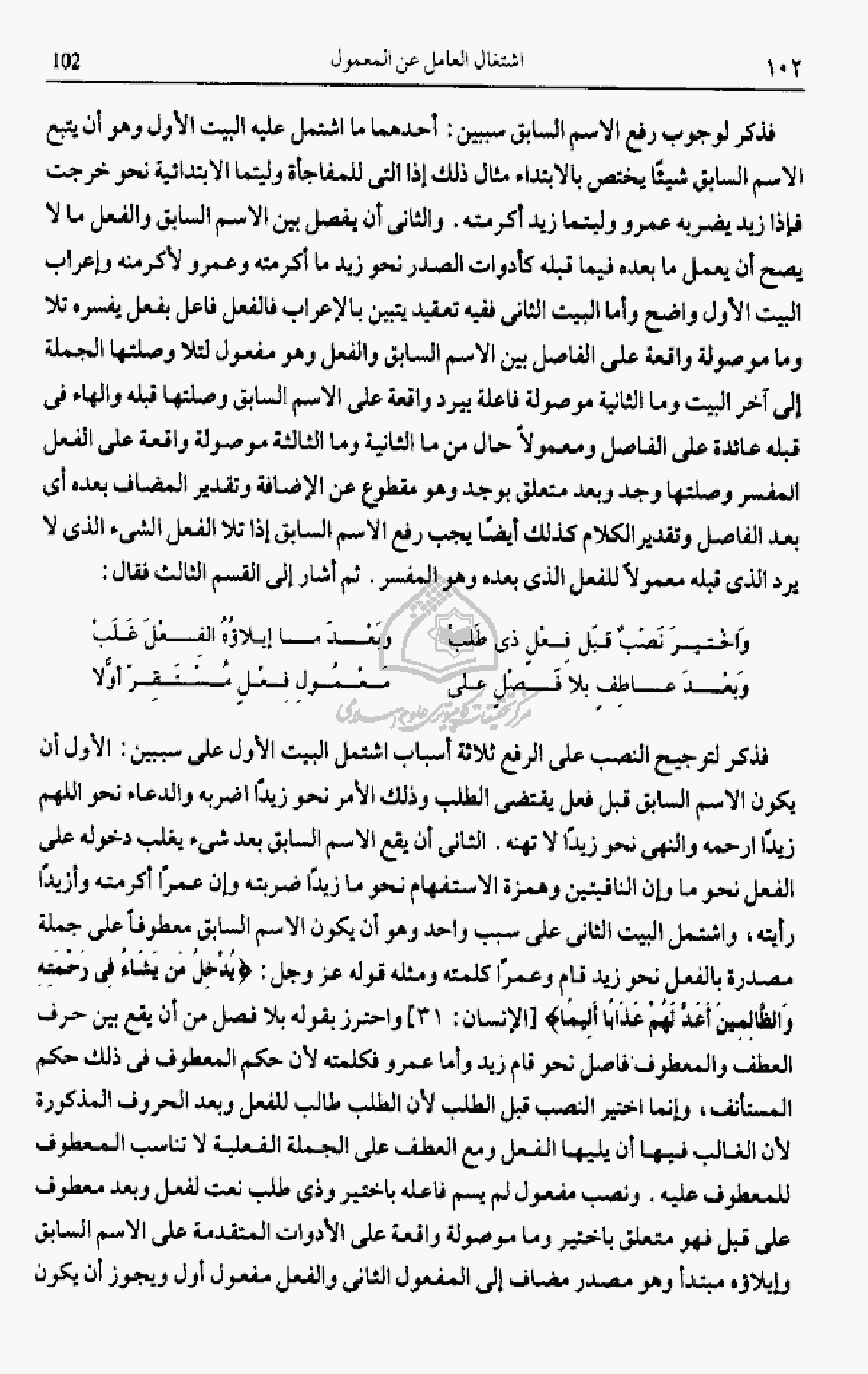 عمرا أكرمته وأزيدا رأيته، واشتمل البيت الثانى على سبب واحد وهو أن يكون الاسم السابق معطوفا على جملة مصدرة بالفعل نحو زيد قام وعمرا كلمته ومثله قوله عز وجل: يُدْخِلُ مَنْ يَشاءُ فِي رَحْمَتِهِ وَالظَّالِمِينَ أَعَدَّ لَهُمْ عَذاباً أَلِيماً [الإنسان: 31] واحترز بقوله بلا فصل من أن يقع بين حرف العطف والمعطوف فاصل نحو قام زيد وأما عمرو فكلمته لأن حكم المعطوف فى ذلك حكم المستأنف، وإنما اختير النصب قبل الطلب لأن الطلب طالب للفعل وبعد الحروف المذكورة لأن الغالب فيها أن يليها الفعل ومع العطف على الجملة الفعلية لا تناسب المعطوف للمعطوف عليه. ونصب مفعول لم يسم فاعله باختير وذى طلب نعت لفعل وبعد معطوف على قبل فهو متعلق باختير وما موصولة واقعة على الأدوات المتقدمة على الاسم السابق وإيلاؤه مبتدأ وهو مصدر مضاف إلى المفعول الثانى والفعل مفعول أول ويجوز أن يكون
