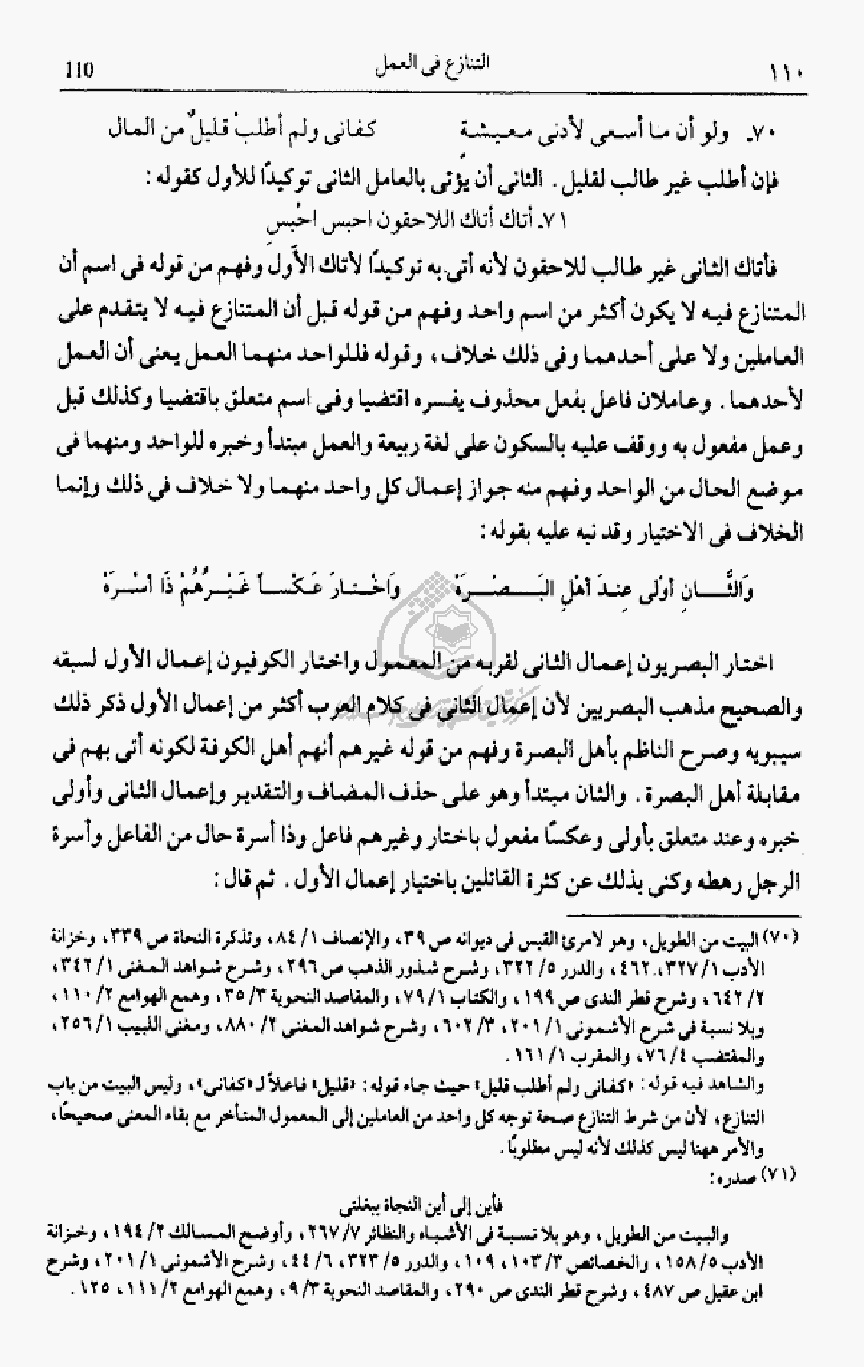 والشاهد فيه قوله: «كفانى ولم أطلب قليل» حيث جاء قوله: «قليل» فاعلا ل «كفانى»، وليس البيت من باب التنازع، لأن من شرط التنازع صحة توجه كل واحد من العاملين إلى المعمول المتأخر مع بقاء المعنى صحيحا، والأمر ههنا ليس كذلك لأنه ليس مطلوبا.