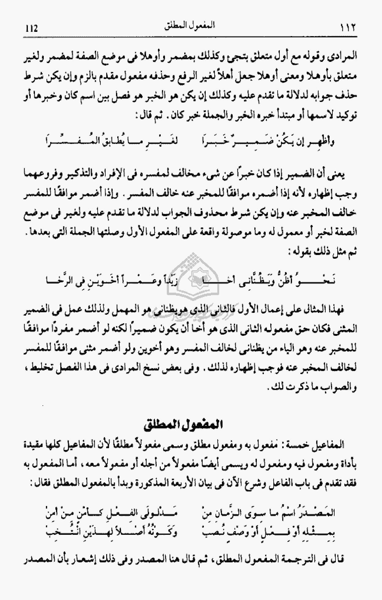 المفاعيل خمسة: مفعول به ومفعول مطلق وسمى مفعولا مطلقا لأن المفاعيل كلها مقيدة بأداة ومفعول فيه ومفعول له ويسمى أيضا مفعولا من أجله أو مفعولا معه، أما المفعول به فقد تقدم فى باب الفاعل وشرع الآن فى بيان الأربعة المذكورة وبدأ بالمفعول المطلق فقال: