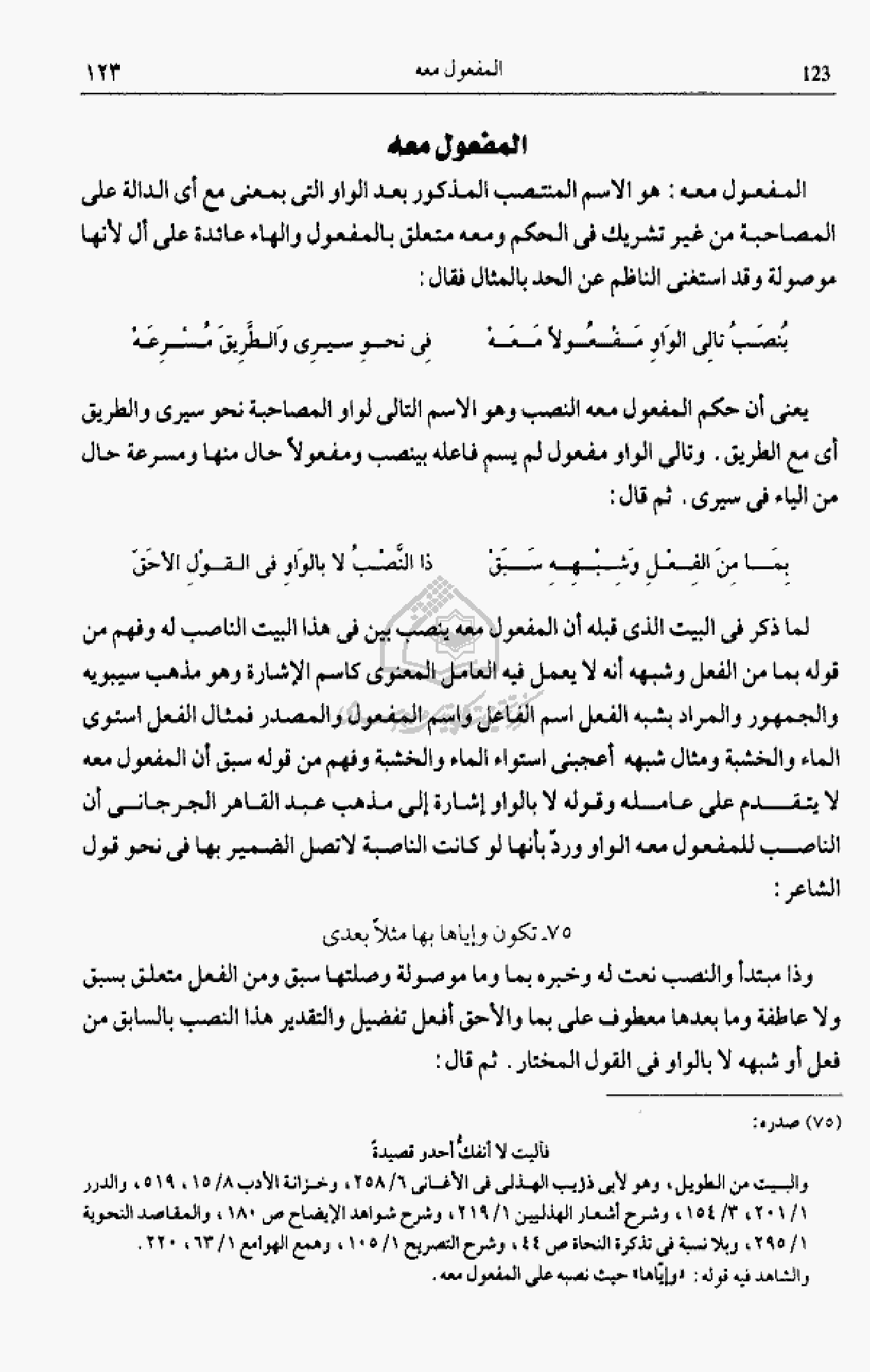 المفعول معه: هو الاسم المنتصب المذكور بعد الواو التى بمعنى مع أى الدالة على المصاحبة من غير تشريك فى الحكم ومعه متعلق بالمفعول والهاء عائدة على أل لأنها موصولة وقد استغنى الناظم عن الحد بالمثال فقال: