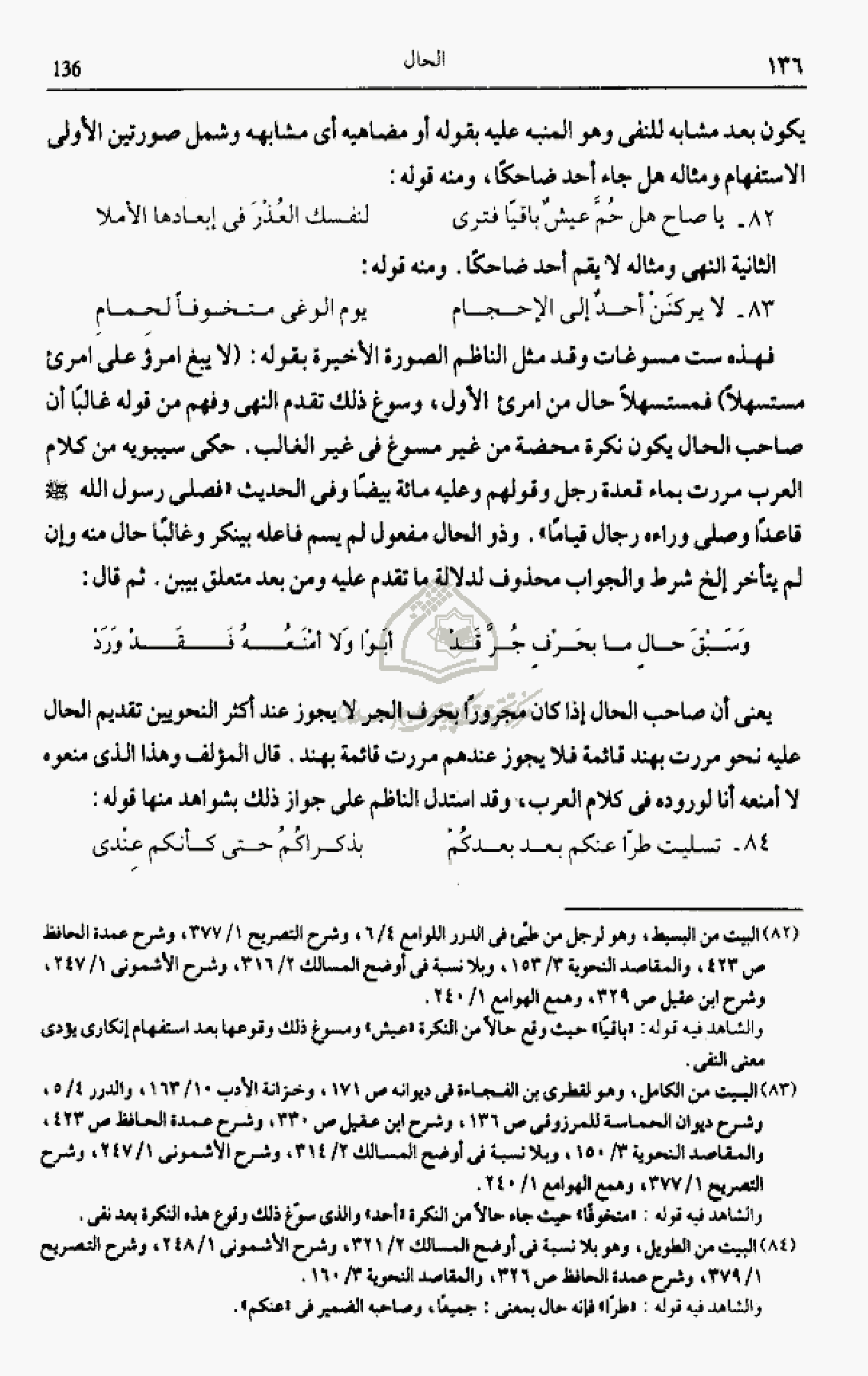 فهذه ست مسوغات وقد مثل الناظم الصورة الأخيرة بقوله: (لا يبغ امرؤ على امرئ مستسهلا) فمستسهلا حال من امرئ الأول، وسوغ ذلك تقدم النهى وفهم من قوله غالبا أن صاحب الحال يكون نكرة محضة من غير مسوغ فى غير الغالب. حكى سيبويه من كلام العرب مررت بماء قعدة رجل وقولهم وعليه مائة بيضا وفى الحديث «فصلى رسول الله صلّى الله عليه وسلّم قاعدا وصلى وراءه رجال قياما». وذو الحال مفعول لم يسم فاعله بينكر وغالبا حال منه وإن لم يتأخر إلخ شرط والجواب محذوف لدلالة ما تقدم عليه ومن بعد متعلق بيبن. ثم قال:
