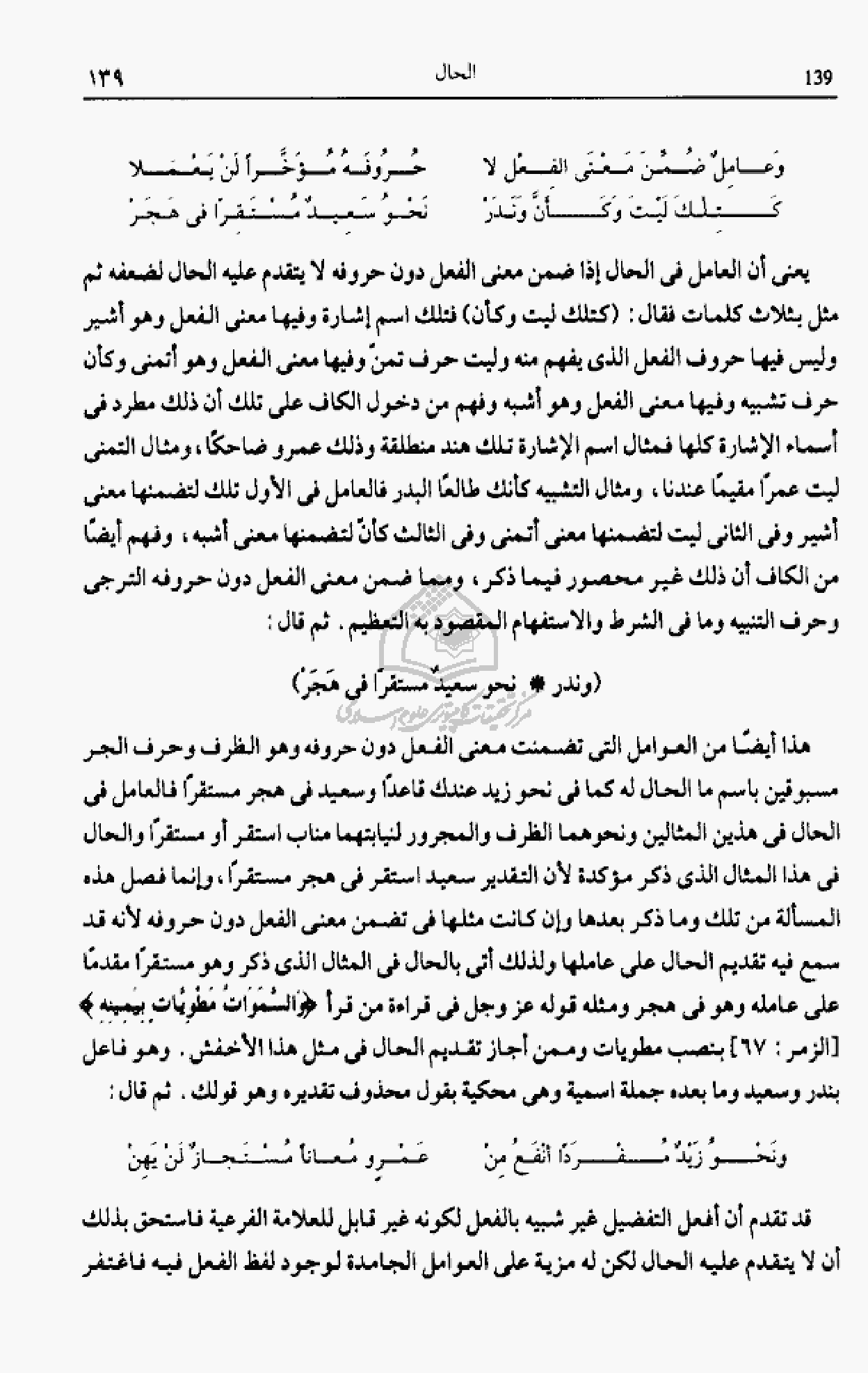 يعنى أن العامل فى الحال إذا ضمن معنى الفعل دون حروفه لا يتقدم عليه الحال لضعفه ثم مثل بثلاث كلمات فقال: (كتلك ليت وكأن) فتلك اسم إشارة وفيها معنى الفعل وهو أشير وليس فيها حروف الفعل الذى يفهم منه وليت حرف تمنّ وفيها معنى الفعل وهو أتمنى وكأن حرف تشبيه وفيها معنى الفعل وهو أشبه وفهم من دخول الكاف على تلك أن ذلك مطرد فى أسماء الإشارة كلها فمثال اسم الإشارة تلك هند منطلقة وذلك عمرو ضاحكا، ومثال التمنى ليت عمرا مقيما عندنا، ومثال التشبيه كأنك طالعا البدر فالعامل فى الأول تلك لتضمنها معنى أشير وفى الثانى ليت لتضمنها معنى أتمنى وفى الثالث كأنّ لتضمنها معنى أشبه، وفهم أيضا من الكاف أن ذلك غير محصور فيما ذكر، ومما ضمن معنى الفعل دون حروفه الترجى وحرف التنبيه وما فى الشرط والاستفهام المقصود به التعظيم. ثم قال: