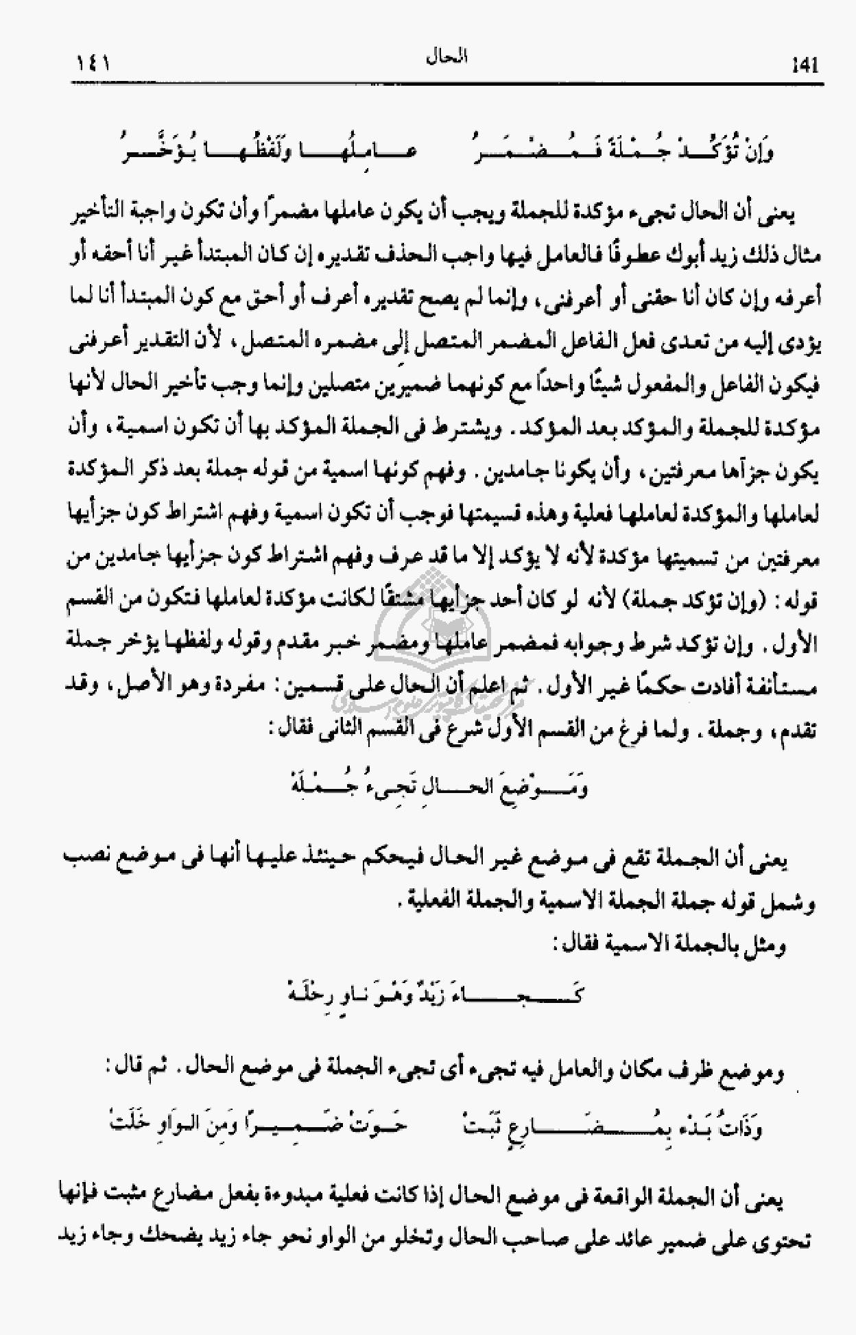 يعنى أن الجملة الواقعة فى موضع الحال إذا كانت فعلية مبدوءة بفعل مضارع مثبت فإنها تحتوى على ضمير عائد على صاحب الحال وتخلو من الواو نحو جاء زيد يضحك وجاء زيد