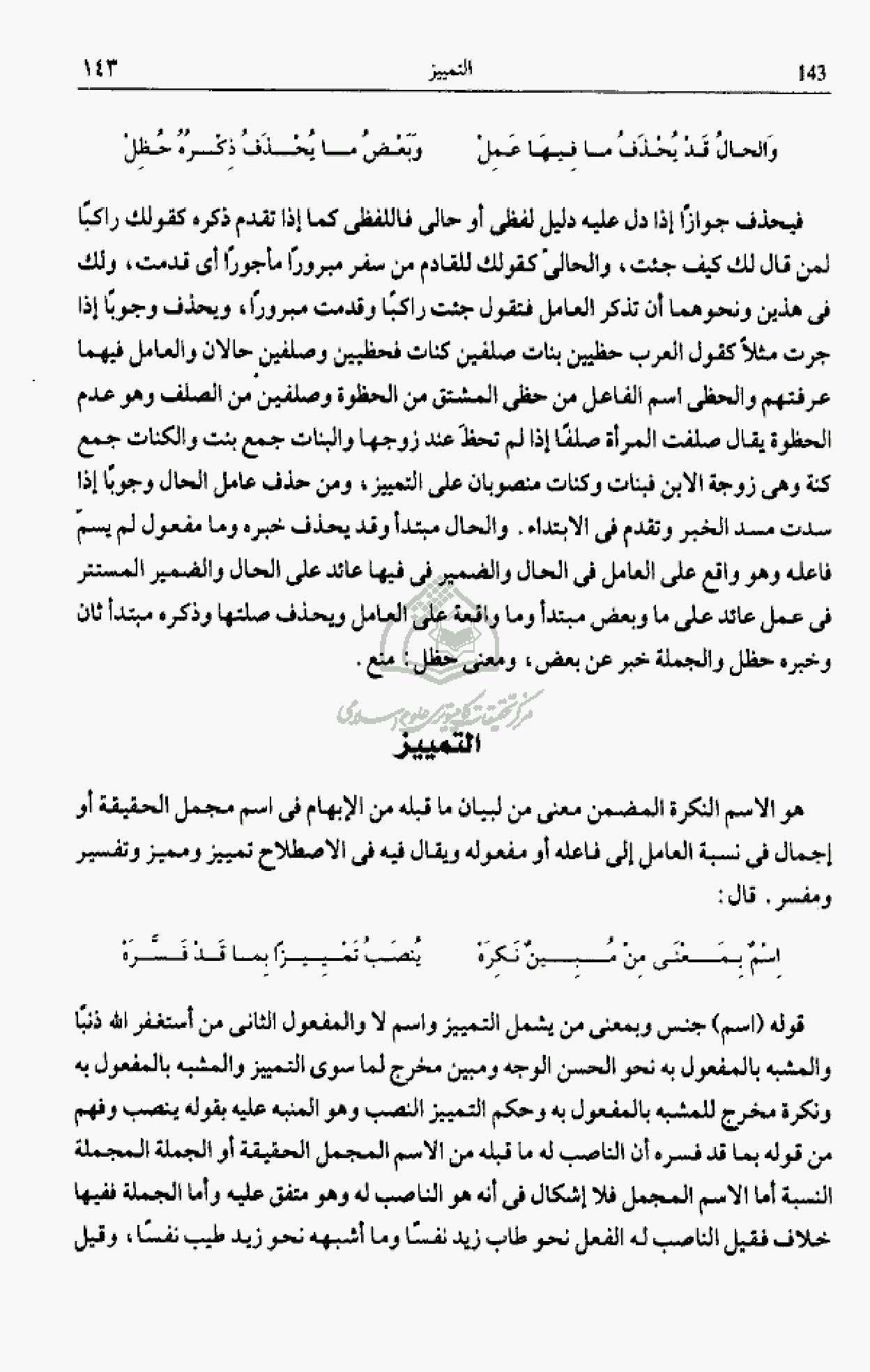 هو الاسم النكرة المضمن معنى من لبيان ما قبله من الإبهام فى اسم مجمل الحقيقة أو إجمال فى نسبة العامل إلى فاعله أو مفعوله ويقال فيه فى الاصطلاح تمييز ومميز وتفسير ومفسر. قال:
