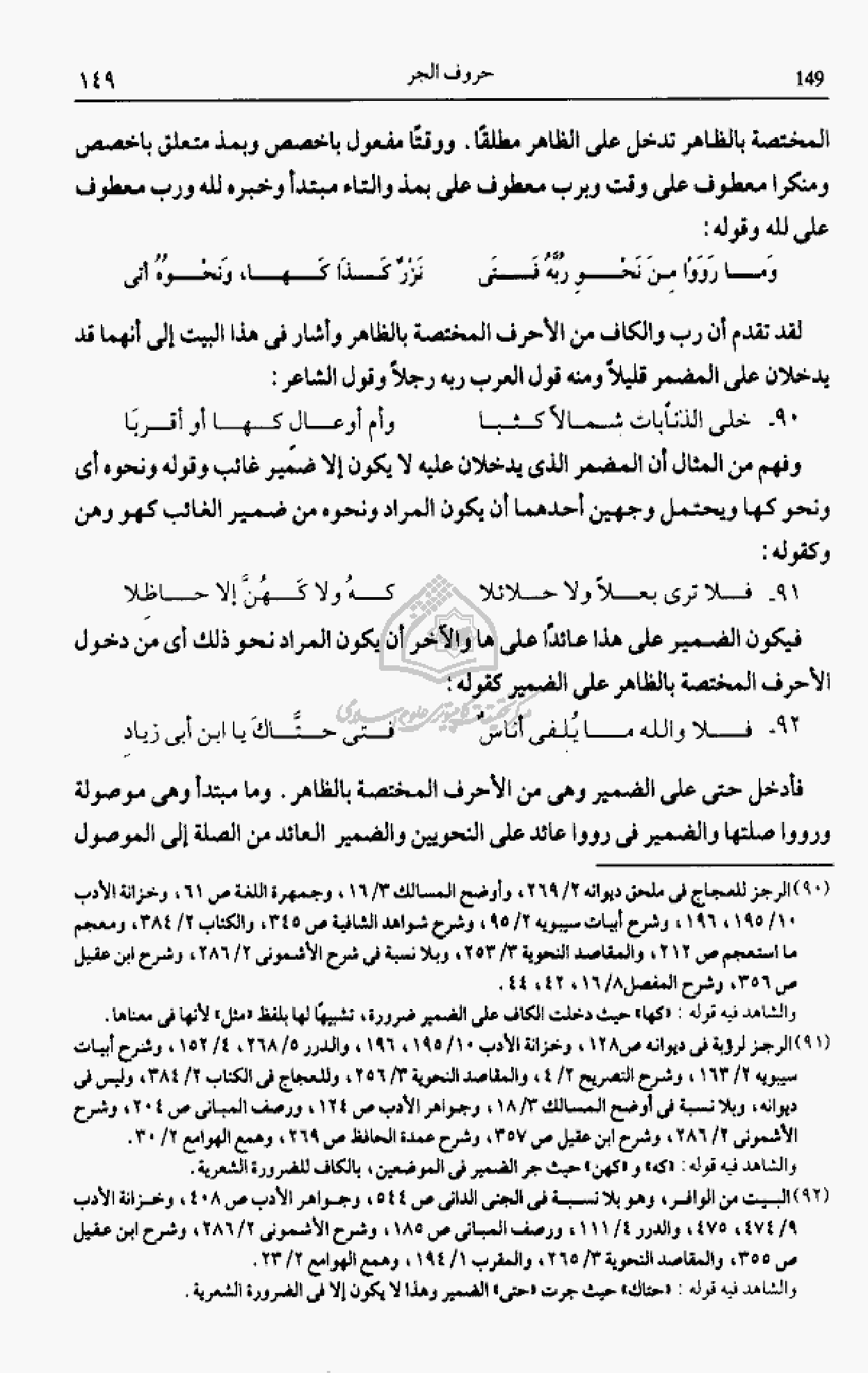 (¬91) الرجز لرؤبة فى ديوانه ص 128، وخزانة الأدب 10/ 195، 196، والدرر 5/ 268، 4/ 152، وشرح أبيات سيبويه 2/ 163، وشرح التصريح 2/ 4، والمقاصد النحوية 3/ 256، وللعجاج فى الكتاب 2/ 384، وليس فى ديوانه، وبلا نسبة فى أوضح المسالك 3/ 18، وجواهر الأدب ص 124، ورصف المبانى ص 204، وشرح الأشمونى 2/ 286، وشرح ابن عقيل ص 357، وشرح عمدة الحافظ ص 269، وهمع الهوامع 2/ 30.