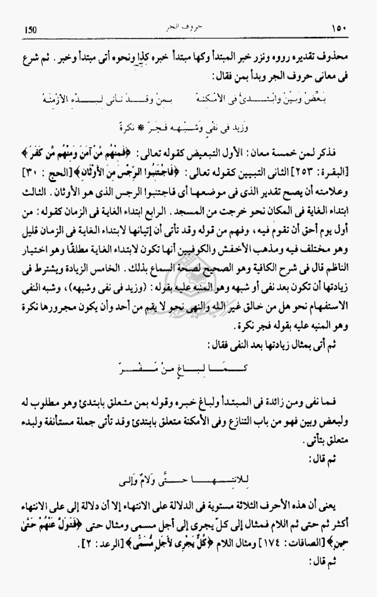 يعنى أن هذه الأحرف الثلاثة مستوية فى الدلالة على الانتهاء إلا أن دلالة إلى على الانتهاء أكثر ثم حتى ثم اللام فمثال إلى كلّ يجرى إلى أجل مسمى ومثال حتى فَتَوَلَّ عَنْهُمْ حَتَّى حِينٍ [الصافات: 174] ومثال اللام كُلٌّ يَجْرِي لِأَجَلٍ مُسَمًّى [الرعد: 2].