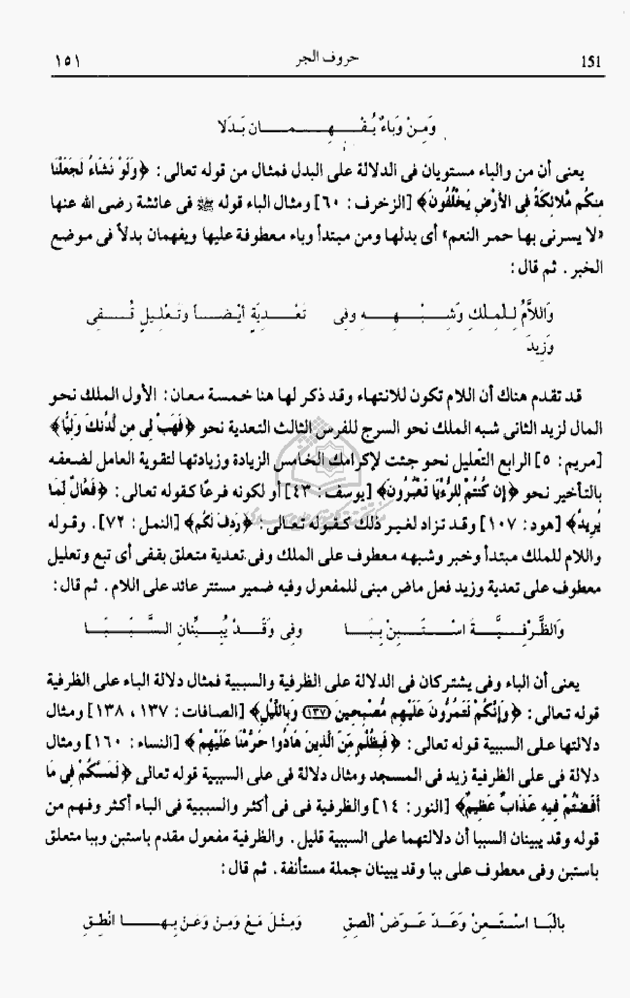 يعنى أن الباء وفى يشتركان فى الدلالة على الظرفية والسببية فمثال دلالة الباء على الظرفية قوله تعالى: وَإِنَّكُمْ لَتَمُرُّونَ عَلَيْهِمْ مُصْبِحِينَ (137) وَبِاللَّيْلِ [الصافات: 137، 138] ومثال دلالتها على السببية قوله تعالى: فَبِظُلْمٍ مِنَ الَّذِينَ هادُوا حَرَّمْنا عَلَيْهِمْ [النساء: 160] ومثال دلالة فى على الظرفية زيد فى المسجد ومثال دلالة فى على السببية قوله تعالى لَمَسَّكُمْ فِيما أَفَضْتُمْ فِيهِ عَذابٌ عَظِيمٌ [النور: 14] والظرفية فى فى أكثر والسببية فى الباء أكثر وفهم من قوله وقد يبينان السببا أن دلالتهما على السببية قليل. والظرفية مفعول مقدم باستبن وببا متعلق باستبن وفى معطوف على ببا وقد يبينان جملة مستأنفة. ثم قال:
