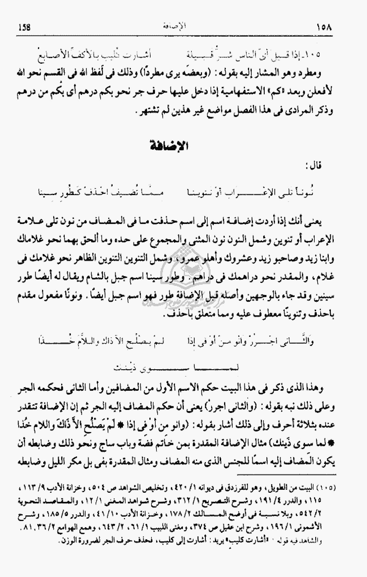 وهذا الذى ذكر فى هذا البيت حكم الاسم الأول من المضافين وأما الثانى فحكمه الجر وعلى ذلك نبه بقوله: (والثانى اجرر) يعنى أن حكم المضاف إليه الجر ثم إن الإضافة تتقدر عنده بثلاثة أحرف وإلى ذلك أشار بقوله: (وانو من أو فى إذا * لم يصلح الّا ذاك واللام خذا * لما سوى ذينك) مثال الإضافة المقدرة بمن خاتم فضة وباب ساج ونحو ذلك وضابطه أن يكون المضاف إليه اسما للجنس الذى منه المضاف ومثال المقدرة بفى بل مكر الليل وضابطه