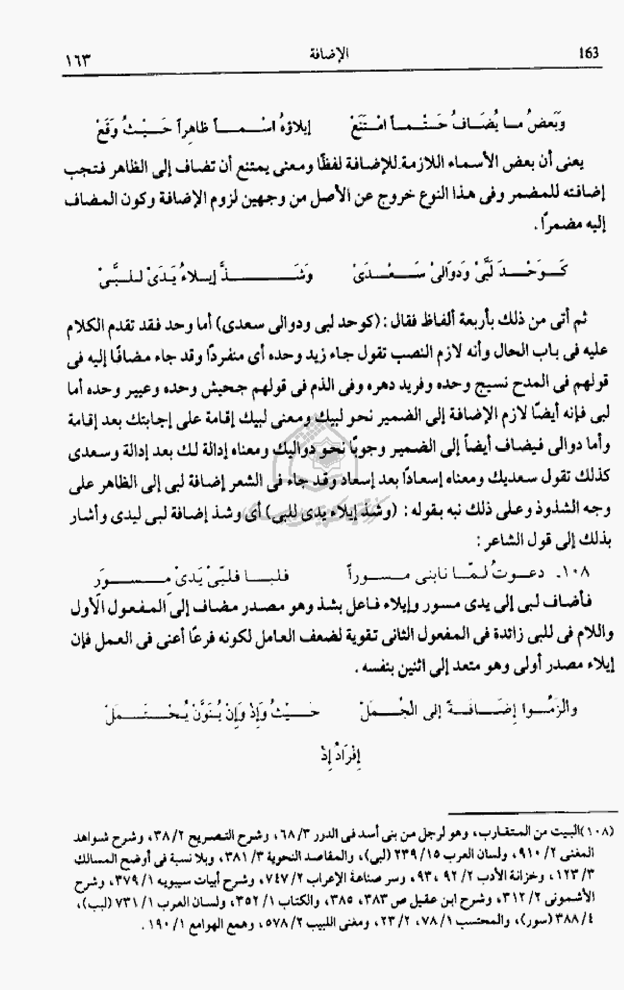 إقامة على إجابتك بعد إقامة وأما دوالى فيضاف أيضا إلى الضمير وجوبا نحو دواليك ومعناه إدالة لك بعد إدالة وسعدى كذلك تقول سعديك ومعناه إسعادا بعد إسعاد وقد جاء فى الشعر إضافة لبى إلى الظاهر على وجه الشذوذ وعلى ذلك نبه بقوله: (وشذ إيلاء يدى للبى) أى وشذ إضافة لبى ليدى وأشار بذلك إلى قول الشاعر: