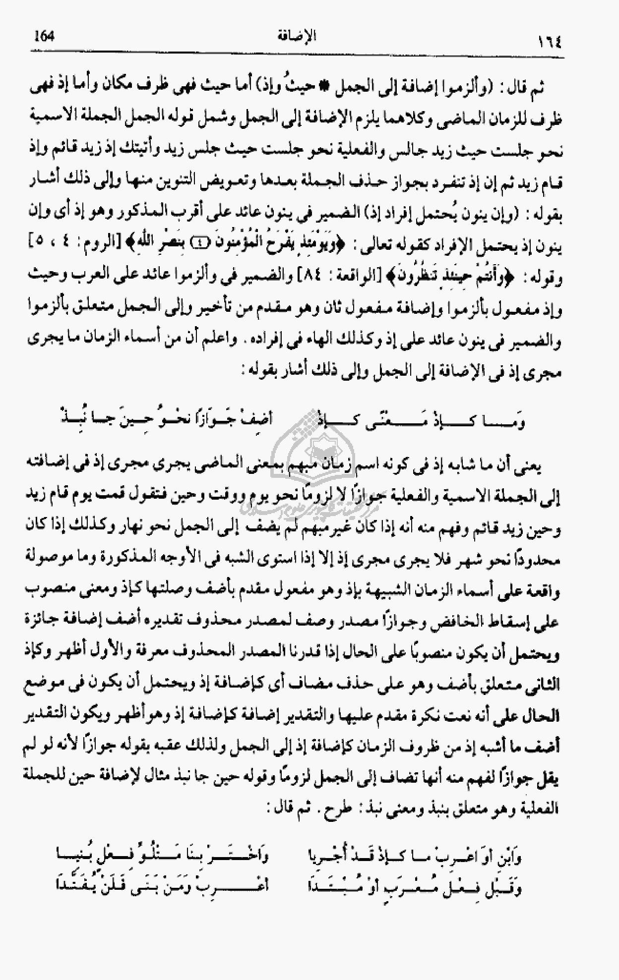 ثم قال: (وألزموا إضافة إلى الجمل * حيث وإذ) أما حيث فهى ظرف مكان وأما إذ فهى ظرف للزمان الماضى وكلاهما يلزم الإضافة إلى الجمل وشمل قوله الجمل الجملة الاسمية نحو جلست حيث زيد جالس والفعلية نحو جلست حيث جلس زيد وأتيتك إذ زيد قائم وإذ قام زيد ثم إن إذ تنفرد بجواز حذف الجملة بعدها وتعويض التنوين منها وإلى ذلك أشار بقوله: (وإن ينون يحتمل إفراد إذ) الضمير فى ينون عائد على أقرب المذكور وهو إذ أى وإن ينون إذ يحتمل الإفراد كقوله تعالى: وَيَوْمَئِذٍ يَفْرَحُ الْمُؤْمِنُونَ (4) بِنَصْرِ اللَّهِ [الروم: 4، 5] وقوله: وَأَنْتُمْ حِينَئِذٍ تَنْظُرُونَ [الواقعة: 84] والضمير فى وألزموا عائد على العرب وحيث وإذ مفعول بألزموا وإضافة مفعول ثان وهو مقدم من تأخير وإلى الجمل متعلق بألزموا والضمير فى ينون عائد على إذ وكذلك الهاء فى إفراده. واعلم أن من أسماء الزمان ما يجرى مجرى إذ فى الإضافة إلى الجمل وإلى ذلك أشار بقوله: