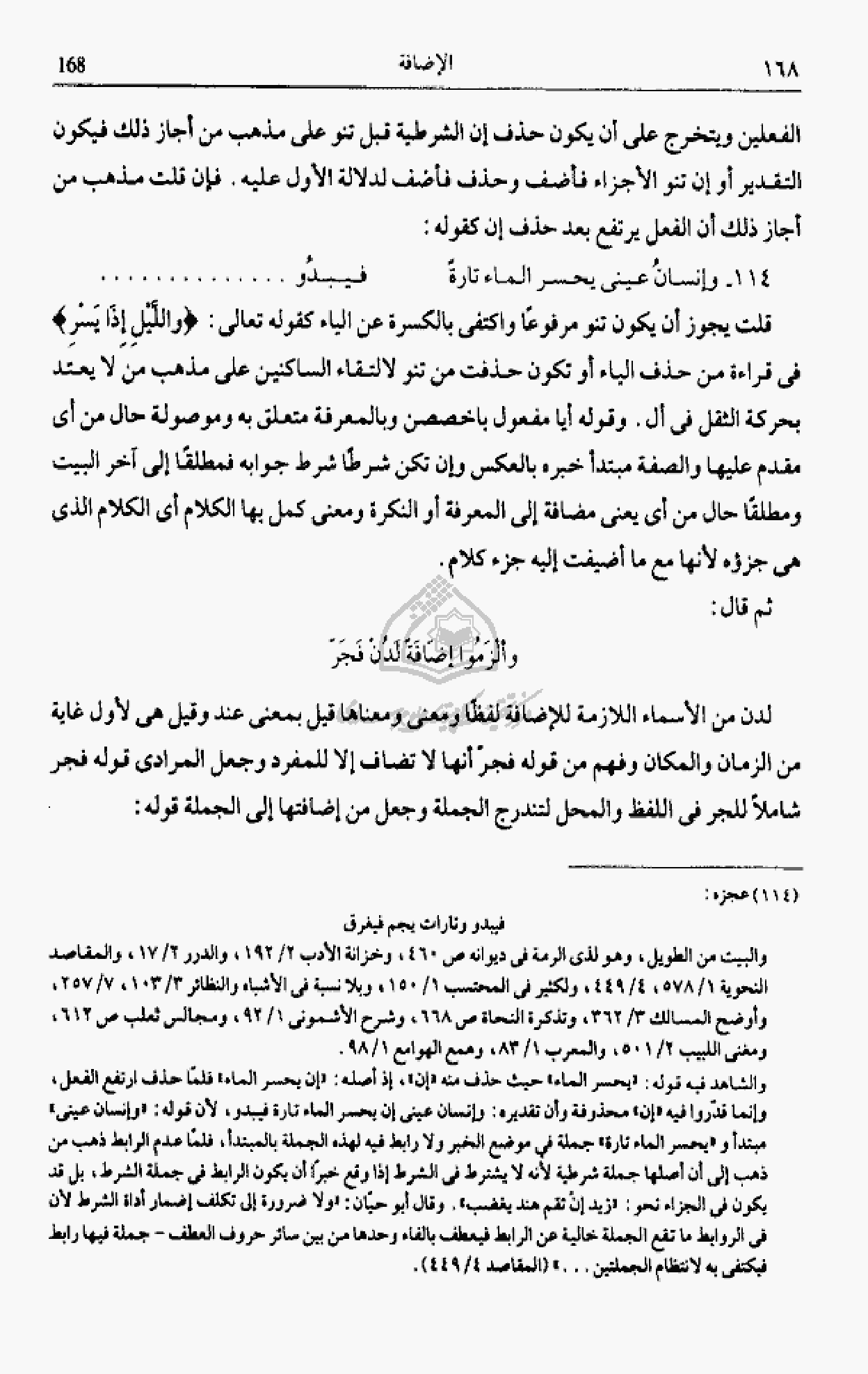 والشاهد فيه قوله: «يحسر الماء» حيث حذف منه «إن»، إذ أصله: «إن يحسر الماء» فلمّا حذف ارتفع الفعل، وإنما قدّروا فيه «إن» محذوفة وأن تقديره: وإنسان عينى إن يحسر الماء تارة فيبدو، لأن قوله: «وإنسان عينى» مبتدأ و «يحسر الماء تارة» جملة في موضع الخبر ولا رابط فيه لهذه الجملة بالمبتدأ، فلمّا عدم الرابط ذهب من ذهب إلى أن أصلها جملة شرطية لأنه لا يشترط فى الشرط إذا وقع خبرا أن يكون الرابط فى جملة الشرط، بل قد يكون فى الجزاء نحو: «زيد إن تقم هند يغضب». وقال أبو حيّان: «ولا ضرورة إلى تكلف إضمار أداة الشرط لأن فى الروابط ما تقع الجملة خالية عن الرابط فيعطف بالفاء وحدها من بين سائر حروف العطف- جملة فيها رابط فيكتفى به لانتظام الجملتين ... » (المقاصد 4/ 449).