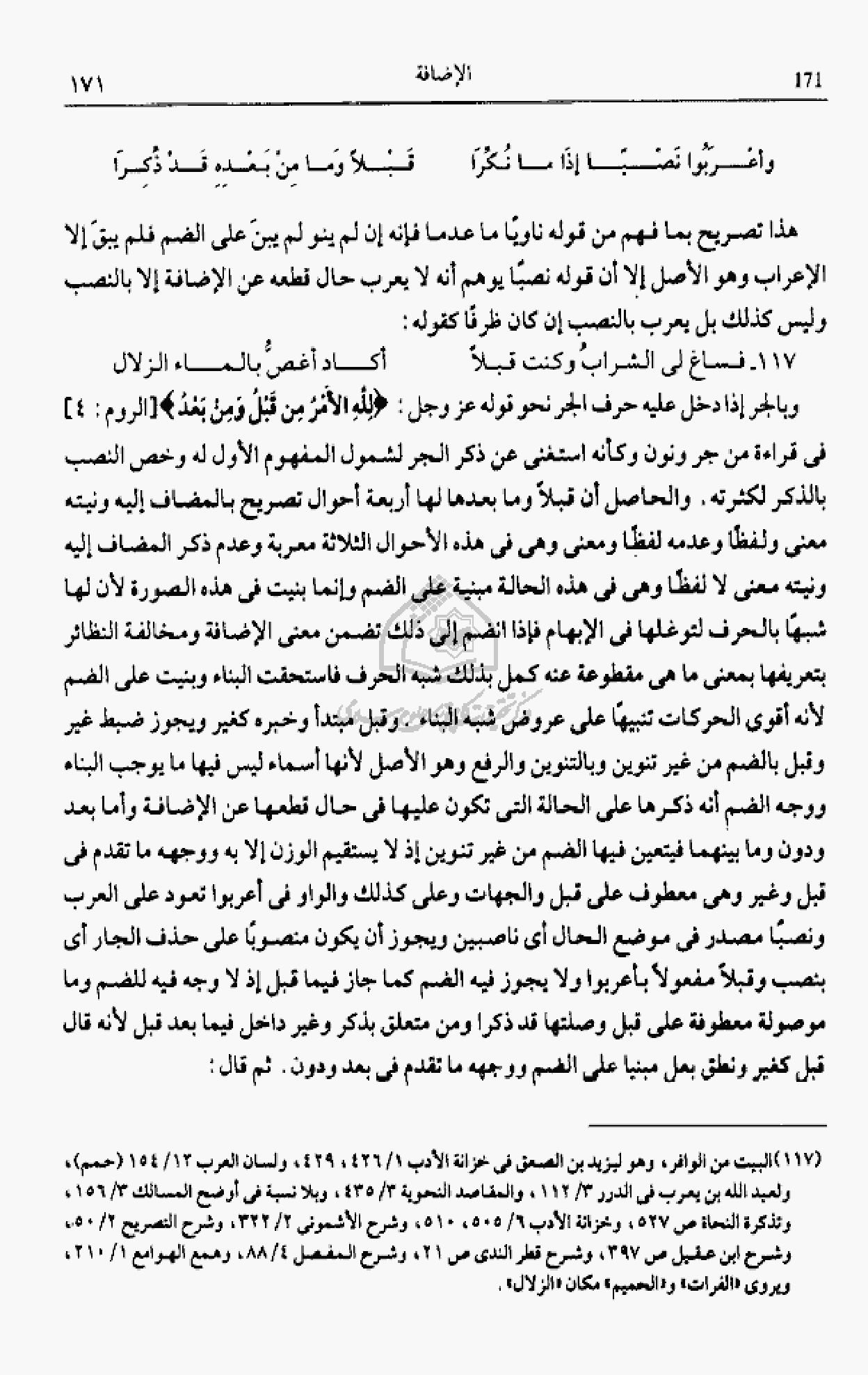 وبالجر إذا دخل عليه حرف الجر نحو قوله عز وجل: لِلَّهِ الْأَمْرُ مِنْ قَبْلُ وَمِنْ بَعْدُ [الروم: 4] فى قراءة من جر ونون
