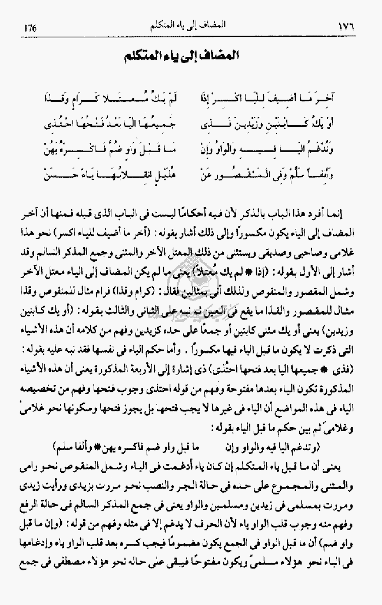 إنما أفرد هذا الباب بالذكر لأن فيه أحكاما ليست فى الباب الذى قبله فمنها أن آخر المضاف إلى الياء يكون مكسورا وإلى ذلك أشار بقوله: (آخر ما أضيف للياء اكسر) نحو هذا غلامى وصاحبى وصديقى ويستثنى من ذلك المعتل الآخر والمثنى وجمع المذكر السالم وقد أشار إلى الأول بقوله: (إذا * لم يك معتلا) يعنى ما لم يكن