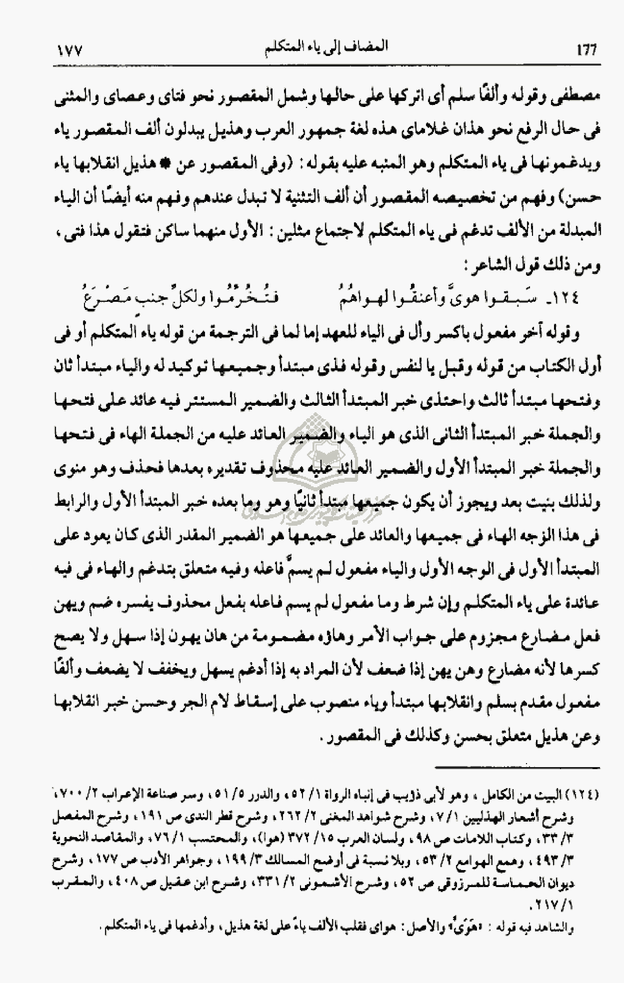 مصطفى وقوله وألفا سلم أى اتركها على حالها وشمل المقصور نحو فتاى وعصاى والمثنى فى حال الرفع نحو هذان غلاماى هذه لغة جمهور العرب وهذيل يبدلون ألف المقصور ياء ويدغمونها فى ياء المتكلم وهو المنبه عليه بقوله: (وفى المقصور عن * هذيل انقلابها ياء حسن) وفهم من تخصيصه المقصور أن ألف التثنية لا تبدل عندهم وفهم منه أيضا أن الياء المبدلة من الألف تدغم فى ياء المتكلم لاجتماع مثلين: الأول منهما ساكن فتقول هذا فتى، ومن ذلك قول الشاعر: