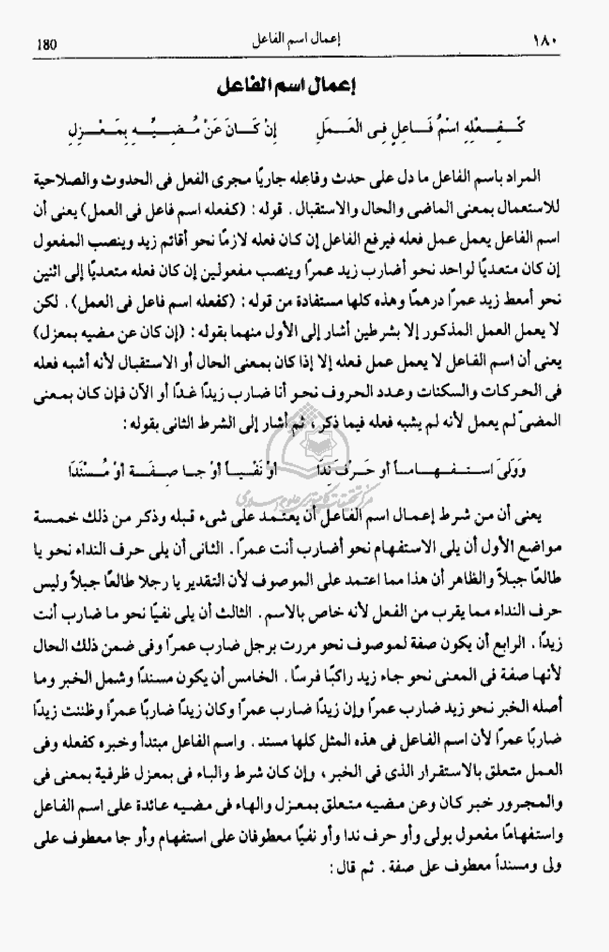 يعنى أن من شرط إعمال اسم الفاعل أن يعتمد على شئ قبله وذكر من ذلك خمسة مواضع الأول أن يلى الاستفهام نحو أضارب أنت عمرا. الثانى أن يلى حرف النداء نحو يا طالعا جبلا والظاهر أن هذا مما اعتمد على الموصوف لأن التقدير يا رجلا طالعا جبلا وليس حرف النداء مما يقرب من الفعل لأنه خاص بالاسم. الثالث أن يلى نفيا نحو ما ضارب أنت زيدا. الرابع أن يكون صفة لموصوف نحو مررت برجل ضارب عمرا وفى ضمن ذلك الحال لأنها صفة فى المعنى نحو جاء زيد راكبا فرسا. الخامس أن يكون مسندا وشمل الخبر وما أصله الخبر نحو زيد ضارب عمرا وإن زيدا ضارب عمرا وكان زيدا ضاربا عمرا وظننت زيدا ضاربا عمرا لأن اسم الفاعل فى هذه المثل كلها مسند. واسم الفاعل مبتدأ وخبره كفعله وفى العمل متعلق بالاستقرار الذى فى الخبر، وإن كان شرط والباء فى بمعزل ظرفية بمعنى فى والمجرور خبر كان وعن مضيه متعلق بمعزل والهاء فى مضيه عائدة على اسم الفاعل واستفهاما مفعول بولى وأو حرف ندا وأو نفيا معطوفان على استفهام وأو جا معطوف على ولى ومسندا معطوف على صفة. ثم قال: