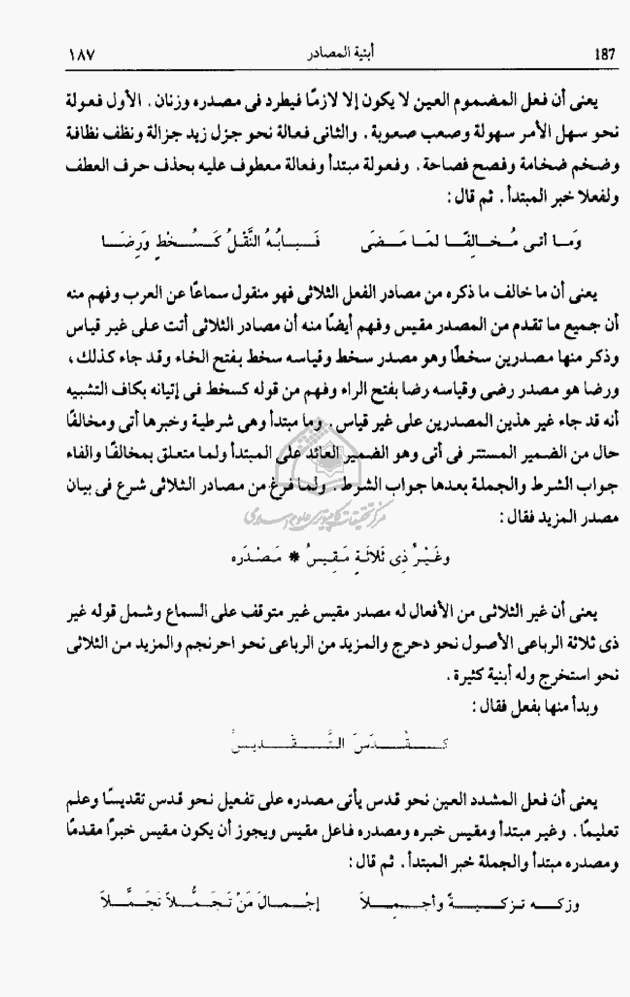 يعنى أن ما خالف ما ذكره من مصادر الفعل الثلاثى فهو منقول سماعا عن العرب وفهم منه أن جميع ما تقدم من المصدر مقيس وفهم أيضا منه أن مصادر الثلاثى أتت على غير قياس وذكر منها مصدرين سخطا وهو مصدر سخط وقياسه سخط بفتح الخاء وقد جاء كذلك، ورضا هو مصدر رضى وقياسه رضا بفتح الراء وفهم من قوله كسخط فى إتيانه بكاف التشبيه أنه قد جاء غير هذين المصدرين على غير قياس. وما مبتدأ وهى شرطية وخبرها أتى ومخالفا حال من الضمير المستتر فى أتى وهو الضمير العائد على المبتدأ ولما متعلق بمخالفا والفاء جواب الشرط والجملة بعدها جواب الشرط. ولما فرغ من مصادر الثلاثى شرع فى بيان مصدر المزيد فقال: