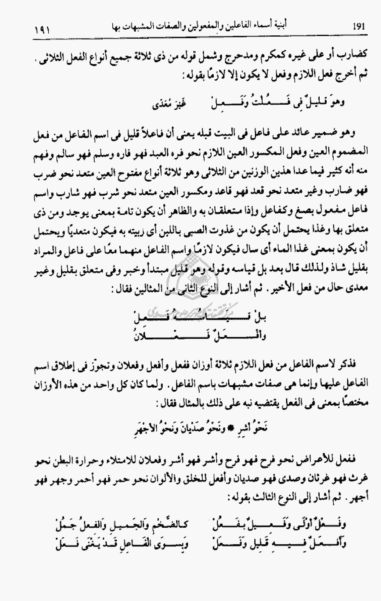 ففعل للأعراض نحو فرح فهو فرح وأشر فهو أشر وفعلان للامتلاء وحرارة البطن نحو غرث فهو غرثان وصدى فهو صديان وأفعل للخلق والألوان نحو حمر فهو أحمر وجهر فهو أجهر. ثم أشار إلى النوع الثالث بقوله: