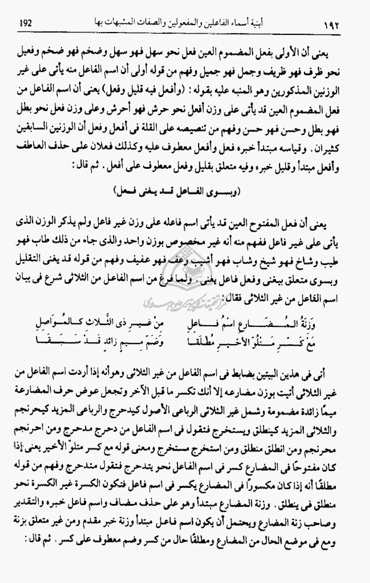 أتى فى هذين البيتين بضابط فى اسم الفاعل من غير الثلاثى وهو أنه إذا أردت اسم الفاعل من غير الثلاثى أتيت بوزن مضارعه إلا أنك تكسر ما قبل الآخر وتجعل عوض حرف المضارعة ميما زائدة مضمومة وشمل غير الثلاثى الرباعى الأصول كيدحرج والرباعى المزيد كيحرنجم والثلاثى المزيد كينطلق ويستخرج فتقول فى اسم الفاعل من دحرج مدحرج ومن احرنجم محرنجم ومن انطلق منطلق ومن استخرج مستخرج ومعنى قوله مع كسر متلوّ الأخير يعنى إذا كان مفتوحا فى المضارع كسر فى اسم الفاعل نحو يتدحرج فتقول متدحرج وفهم من قوله مطلقا أنه إذا كان مكسورا فى المضارع يكسر فى اسم فاعل فتكون الكسرة غير الكسرة نحو منطلق فى ينطلق. وزنة المضارع مبتدأ وهو على حذف مضاف واسم فاعل خبره والتقدير وصاحب زنة المضارع ويحتمل أن يكون اسم فاعل مبتدأ وزنة خبر مقدم ومن غير متعلق بزنة ومع فى موضع الحال من المضارع ومطلقا حال من كسر وضم معطوف على كسر. ثم قال: