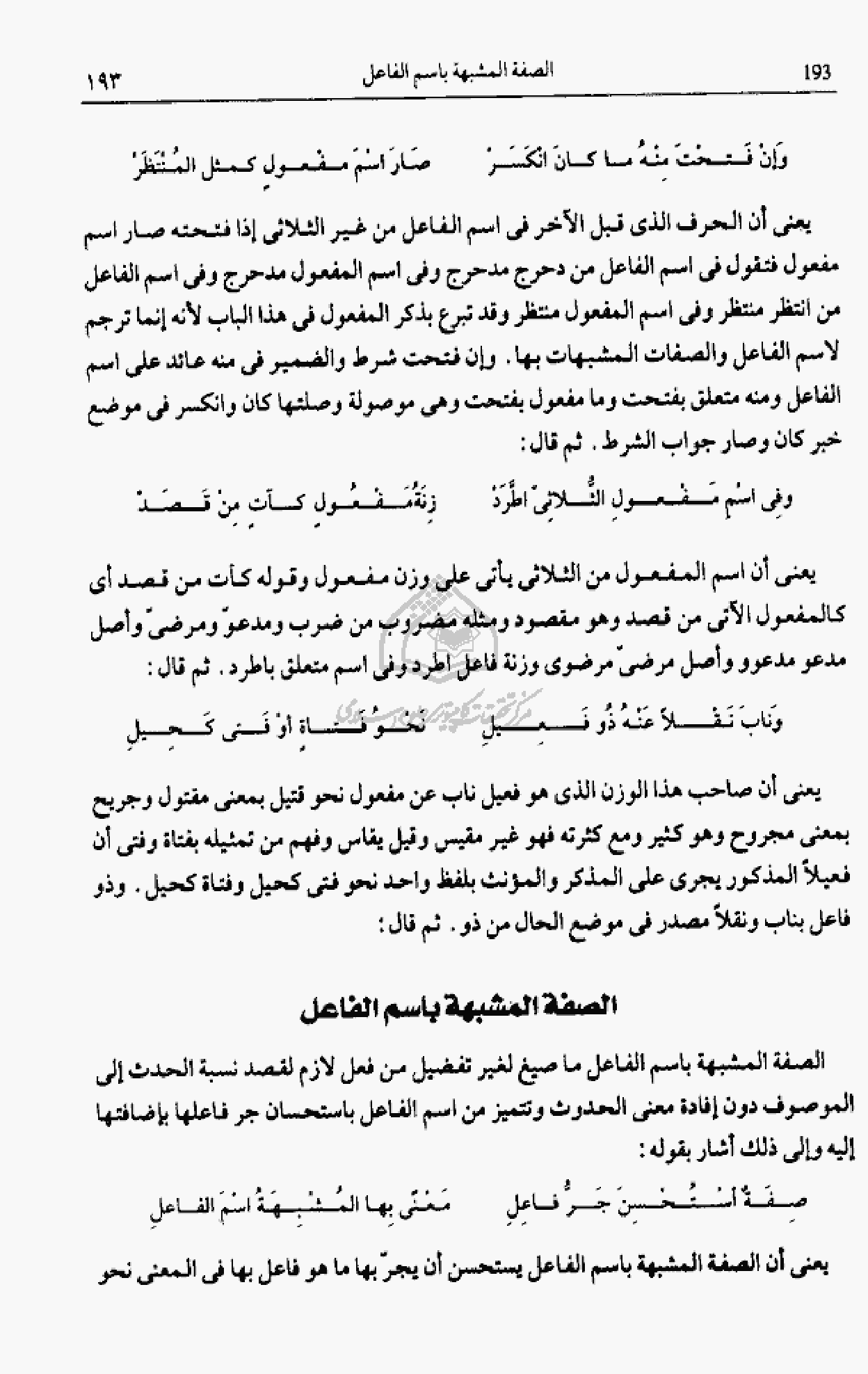 الصفة المشبهة باسم الفاعل ما صيغ لغير تفضيل من فعل لازم لقصد نسبة الحدث إلى الموصوف دون إفادة معنى الحدوث وتتميز من اسم الفاعل باستحسان جر فاعلها بإضافتها إليه وإلى ذلك أشار بقوله:
