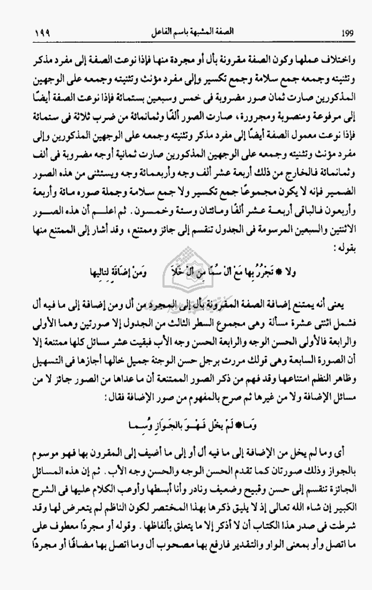 واختلاف عملها وكون الصفة مقرونة بأل أو مجردة منها فإذا نوعت الصفة إلى مفرد مذكر وتثنيته وجمعه جمع سلامة وجمع تكسير وإلى مفرد مؤنث وتثنيته وجمعه على الوجهين المذكورين صارت ثمان صور مضروبة فى خمس وسبعين بستمائة فإذا نوعت الصفة أيضا إلى مرفوعة ومنصوبة ومجرورة، صارت الصور ألفا وثمانمائة من ضرب ثلاثة فى ستمائة فإذا نوعت معمول الصفة أيضا إلى مفرد مذكر وتثنيته وجمعه على الوجهين المذكورين وإلى مفرد مؤنث وتثنيته وجمعه على الوجهين المذكورين صارت ثمانية أوجه مضروبة فى ألف وثمانمائة فالخارج من ذلك أربعة عشر ألف وجه وأربعمائة وجه ويستثنى من هذه الصور الضمير فإنه لا يكون مجموعا جمع تكسير ولا جمع سلامة وجملة صوره مائة وأربعة وأربعون فالباقى أربعة عشر ألفا ومائتان وستة وخمسون. ثم اعلم أن هذه الصور الاثنتين والسبعين المرسومة فى الجدول تنقسم إلى جائز وممتنع، وقد أشار إلى الممتنع منها بقوله: