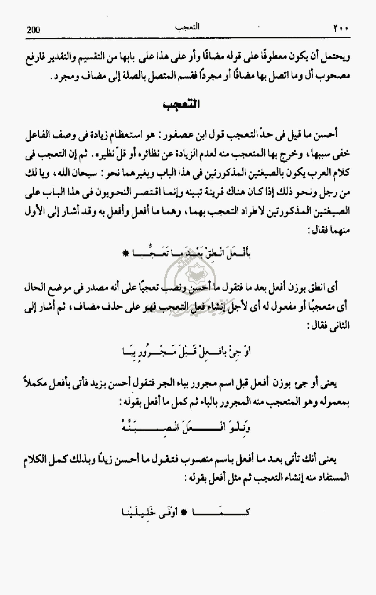 أحسن ما قيل فى حدّ التعجب قول ابن عصفور: هو استعظام زيادة فى وصف الفاعل خفى سببها، وخرج بها المتعجب منه لعدم الزيادة عن نظائره أو قلّ نظيره. ثم إن التعجب فى كلام العرب يكون بالصيغتين المذكورتين فى هذا الباب وبغيرهما نحو: سبحان الله، ويا لك من رجل ونحو ذلك إذا كان هناك قرينة تبينه وإنما اقتصر النحويون فى هذا الباب على الصيغتين المذكورتين لاطراد التعجب بهما، وهما ما أفعل وأفعل به وقد أشار إلى الأول منهما فقال: