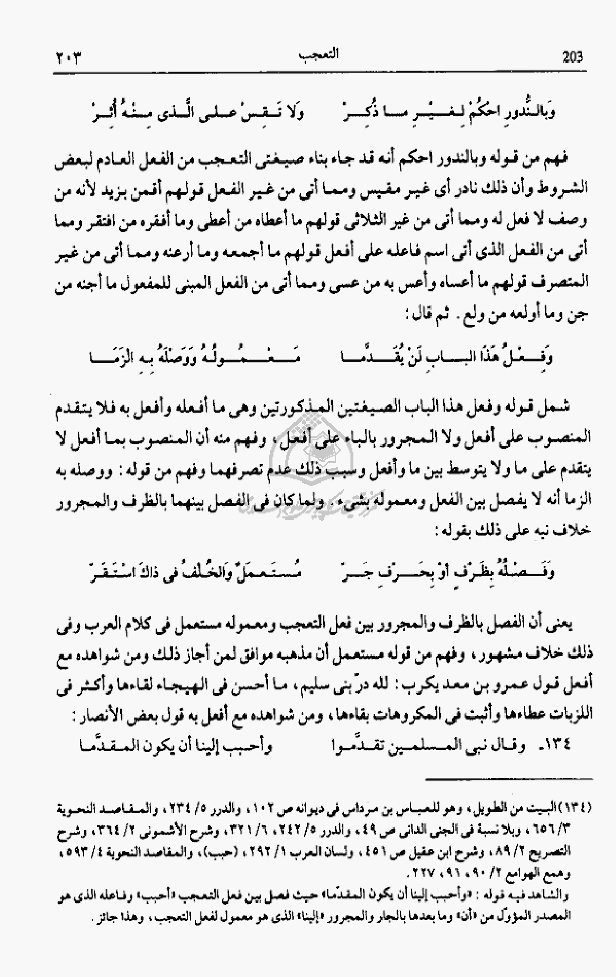 والشاهد فيه قوله: «وأحبب إلينا أن يكون المقدّما» حيث فصل بين فعل التعجب «أحبب» وفاعله الذى هو المصدر المؤوّل من «أن» وما بعدها بالجار والمجرور «إلينا» الذى هو معمول لفعل التعجب، وهذا جائز.