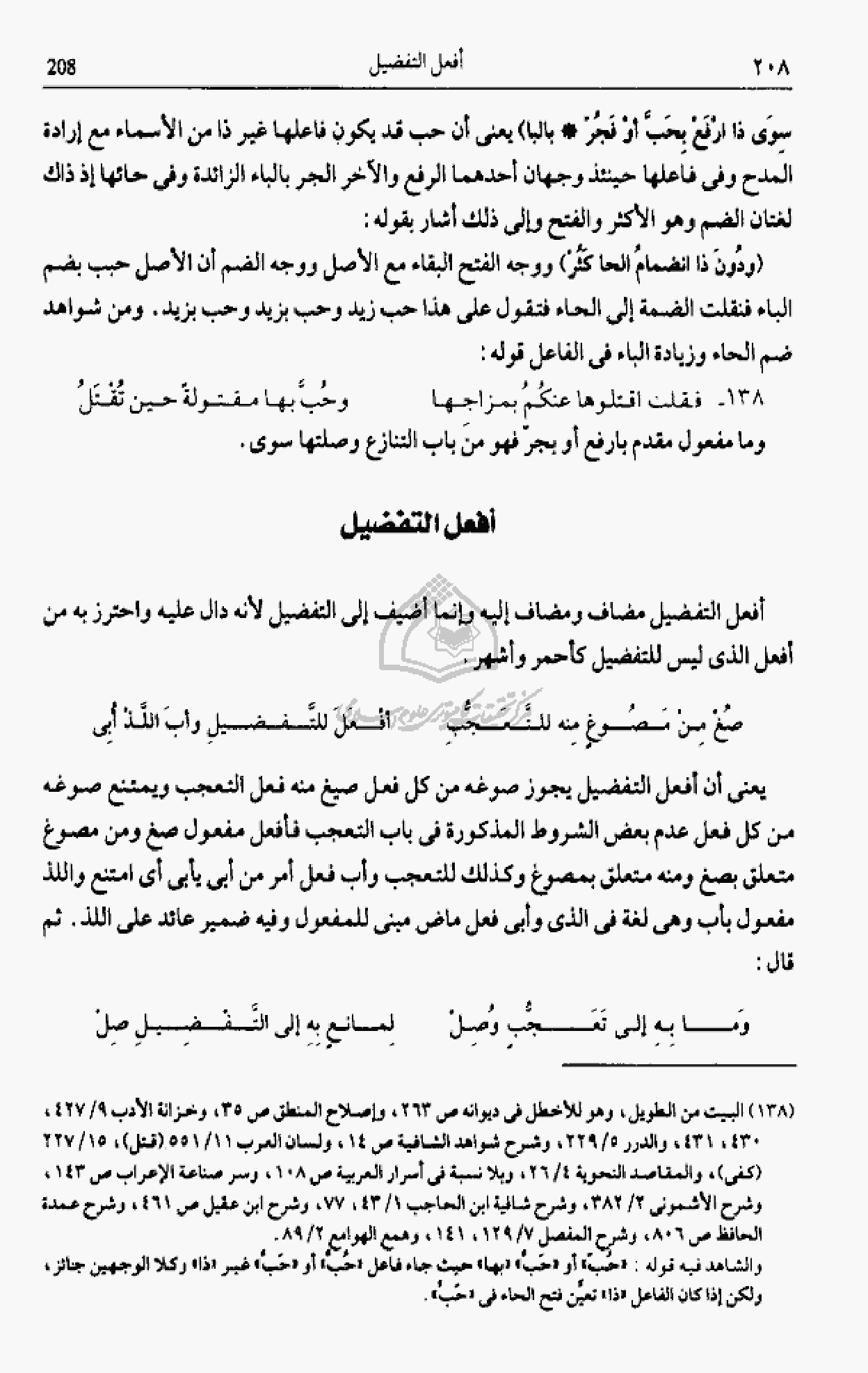 والشاهد فيه قوله: «حبّ» أو «حبّ» «بها» حيث جاء فاعل «حبّ» أو «حبّ» غير «ذا» وكلا الوجهين جائز، ولكن إذا كان الفاعل «ذا» تعيّن فتح الحاء فى «حبّ».