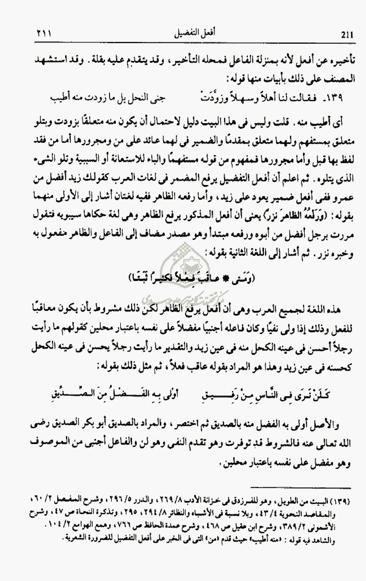 أى أطيب منه. قلت وليس فى هذا البيت دليل لاحتمال أن يكون منه متعلقا بزودت وبتلو متعلق بمستفهم ولهما متعلق بمقدما والضمير فى لهما عائد على من ومجرورها أما من فقد لفظ بها قبل وأما مجرورها فمفهوم من قوله مستفهما والباء للاستعانة أو السببية وتلو الشئ الذى يتلوه. ثم اعلم أن أفعل التفضيل يرفع المضمر فى لغات العرب كقولك زيد أفضل من عمرو ففى أفعل ضمير يعود على زيد، وأما رفعه الظاهر ففيه لغتان أشار إلى الأولى منهما بقوله: (ورفعه الظاهر نزر) يعنى أن أفعل المذكور يرفع الظاهر وهى لغة حكاها سيبويه فتقول مررت برجل أفضل من أبوه ورفعه مبتدأ وهو مصدر مضاف إلى الفاعل والظاهر مفعول به وخبره نزر. ثم أشار إلى اللغة الثانية بقوله: