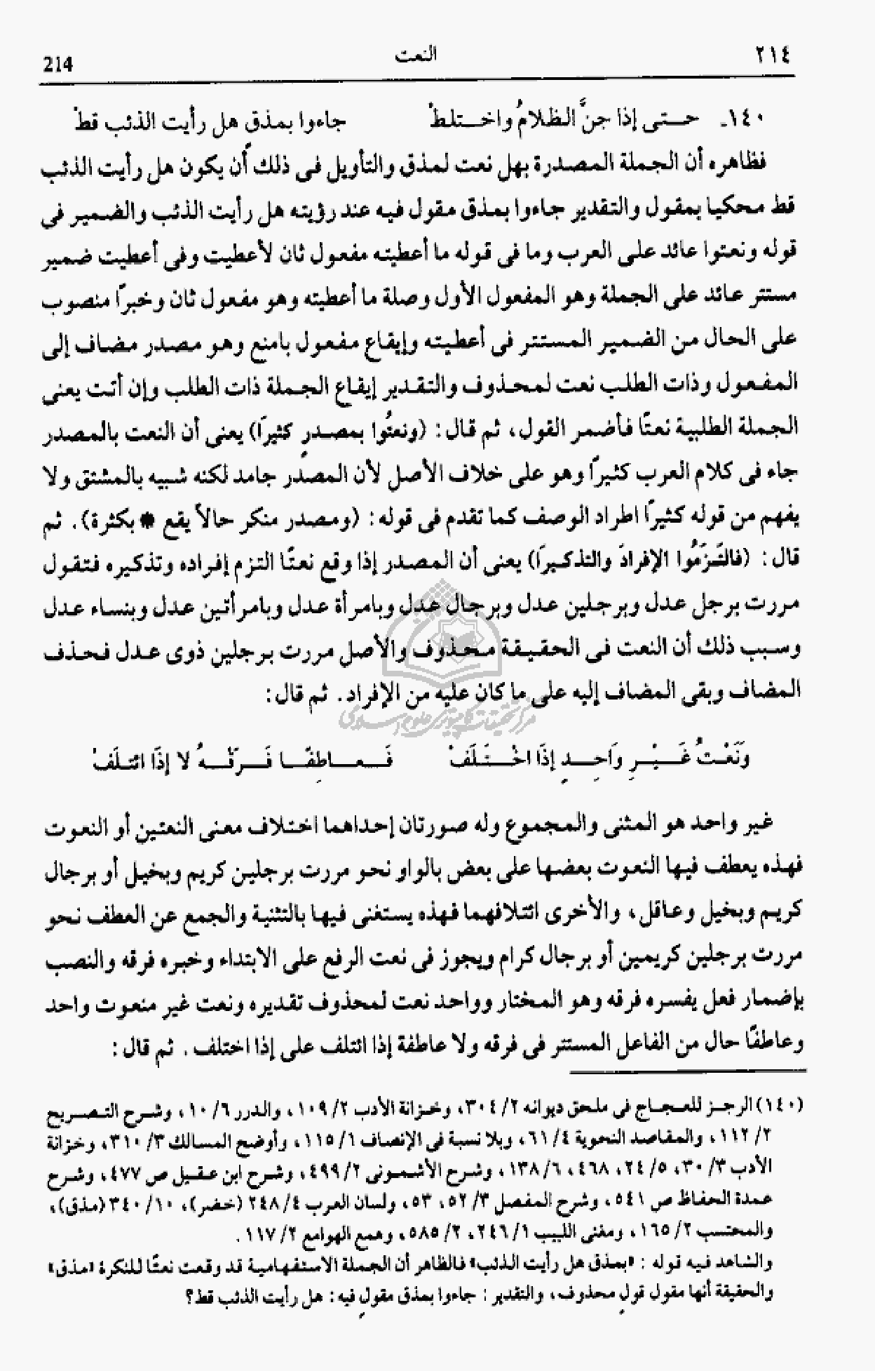 فظاهره أن الجملة المصدرة بهل نعت لمذق والتأويل فى ذلك أن يكون هل رأيت الذئب قط محكيا بمقول والتقدير جاءوا بمذق مقول فيه عند رؤيته هل رأيت الذئب والضمير فى قوله ونعتوا عائد على العرب وما فى قوله ما أعطيته مفعول ثان لأعطيت وفى أعطيت ضمير مستتر عائد على الجملة وهو المفعول الأول وصلة ما أعطيته وهو مفعول ثان وخبرا منصوب على الحال من الضمير المستتر فى أعطيته وإيقاع مفعول بامنع وهو مصدر مضاف إلى المفعول وذات الطلب نعت لمحذوف والتقدير إيقاع الجملة ذات الطلب وإن أتت يعنى الجملة الطلبية نعتا فأضمر القول، ثم قال: (ونعتوا بمصدر كثيرا) يعنى أن النعت بالمصدر جاء فى كلام العرب كثيرا وهو على خلاف الأصل لأن المصدر جامد لكنه شبيه بالمشتق ولا يفهم من قوله كثيرا اطراد الوصف كما تقدم فى قوله: (ومصدر منكر حالا يقع * بكثرة). ثم قال: (فالتزموا الإفراد والتذكيرا) يعنى أن المصدر إذا وقع نعتا التزم إفراده وتذكيره فتقول مررت برجل عدل وبرجلين عدل وبرجال عدل وبامرأة عدل وبامرأتين عدل وبنساء عدل وسبب ذلك أن النعت فى الحقيقة محذوف والأصل مررت برجلين ذوى عدل فحذف المضاف وبقى المضاف إليه على ما كان عليه من الإفراد. ثم قال: