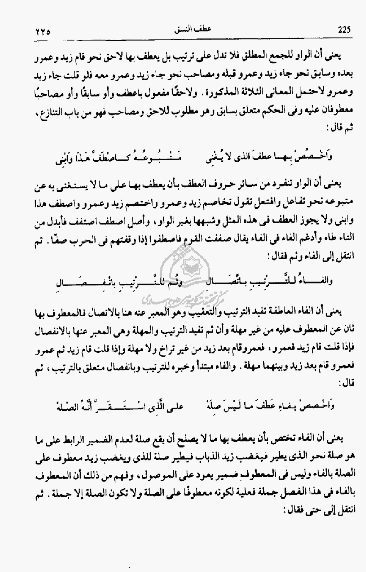 يعنى أن الواو للجمع المطلق فلا تدل على ترتيب بل يعطف بها لاحق نحو قام زيد وعمرو بعده وسابق نحو جاء زيد وعمرو قبله ومصاحب نحو جاء زيد وعمرو معه فلو قلت جاء زيد وعمرو لاحتمل المعانى الثلاثة المذكورة. ولا حقا مفعول باعطف وأو سابقا وأو مصاحبا معطوفان عليه وفى الحكم متعلق بسابق وهو مطلوب للاحق ومصاحب فهو من باب التنازع، ثم قال: