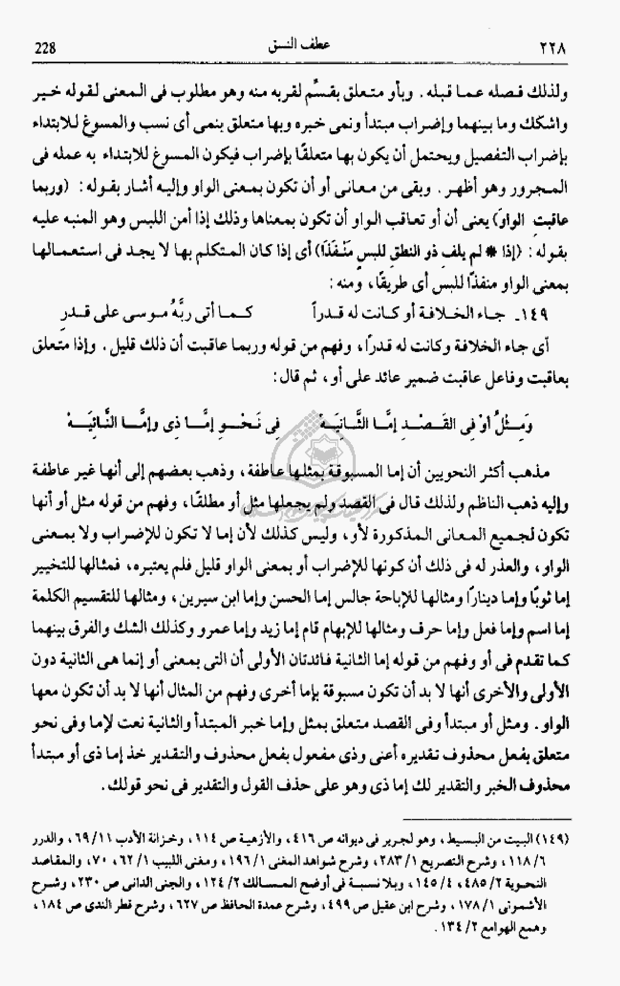 ولذلك فصله عما قبله. وبأو متعلق بقسّم لقربه منه وهو مطلوب فى المعنى لقوله خير واشكك وما بينهما وإضراب مبتدأ ونمى خبره وبها متعلق بنمى أى نسب والمسوغ للابتداء بإضراب التفصيل ويحتمل أن يكون بها متعلقا بإضراب فيكون المسوغ للابتداء به عمله فى المجرور وهو أظهر. وبقى من معانى أو أن تكون بمعنى الواو وإليه أشار بقوله: (وربما عاقبت الواو) يعنى أن أو تعاقب الواو أن تكون بمعناها وذلك إذا أمن اللبس وهو المنبه عليه بقوله: (إذا * لم يلف ذو النطق للبس منفذا) أى إذا كان المتكلم بها لا يجد فى استعمالها بمعنى الواو منفذا للبس أى طريقا، ومنه:
