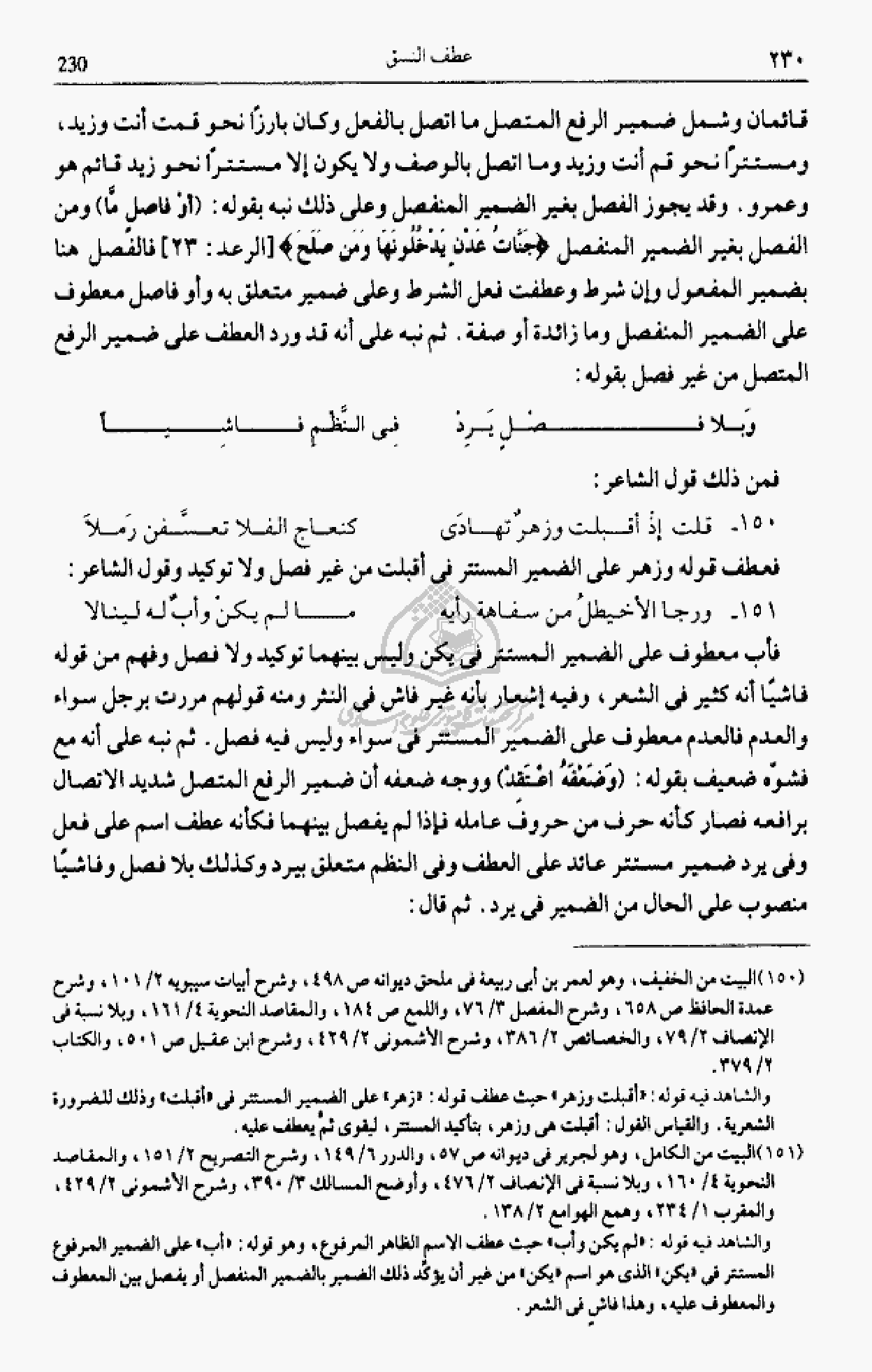 قائمان وشمل ضمير الرفع المتصل ما اتصل بالفعل وكان بارزا نحو قمت أنت وزيد، ومستترا نحو قم أنت وزيد وما اتصل بالوصف ولا يكون إلا مستترا نحو زيد قائم هو وعمرو. وقد يجوز الفصل بغير الضمير المنفصل وعلى ذلك نبه بقوله: (أو فاصل مّا) ومن الفصل بغير الضمير المنفصل جَنَّاتُ عَدْنٍ يَدْخُلُونَها وَمَنْ صَلَحَ [الرعد: 23] فالفصل هنا بضمير المفعول وإن شرط وعطفت فعل الشرط وعلى ضمير متعلق به وأو فاصل معطوف على الضمير المنفصل وما زائدة أو صفة. ثم نبه على أنه قد ورد العطف على ضمير الرفع المتصل من غير فصل بقوله: