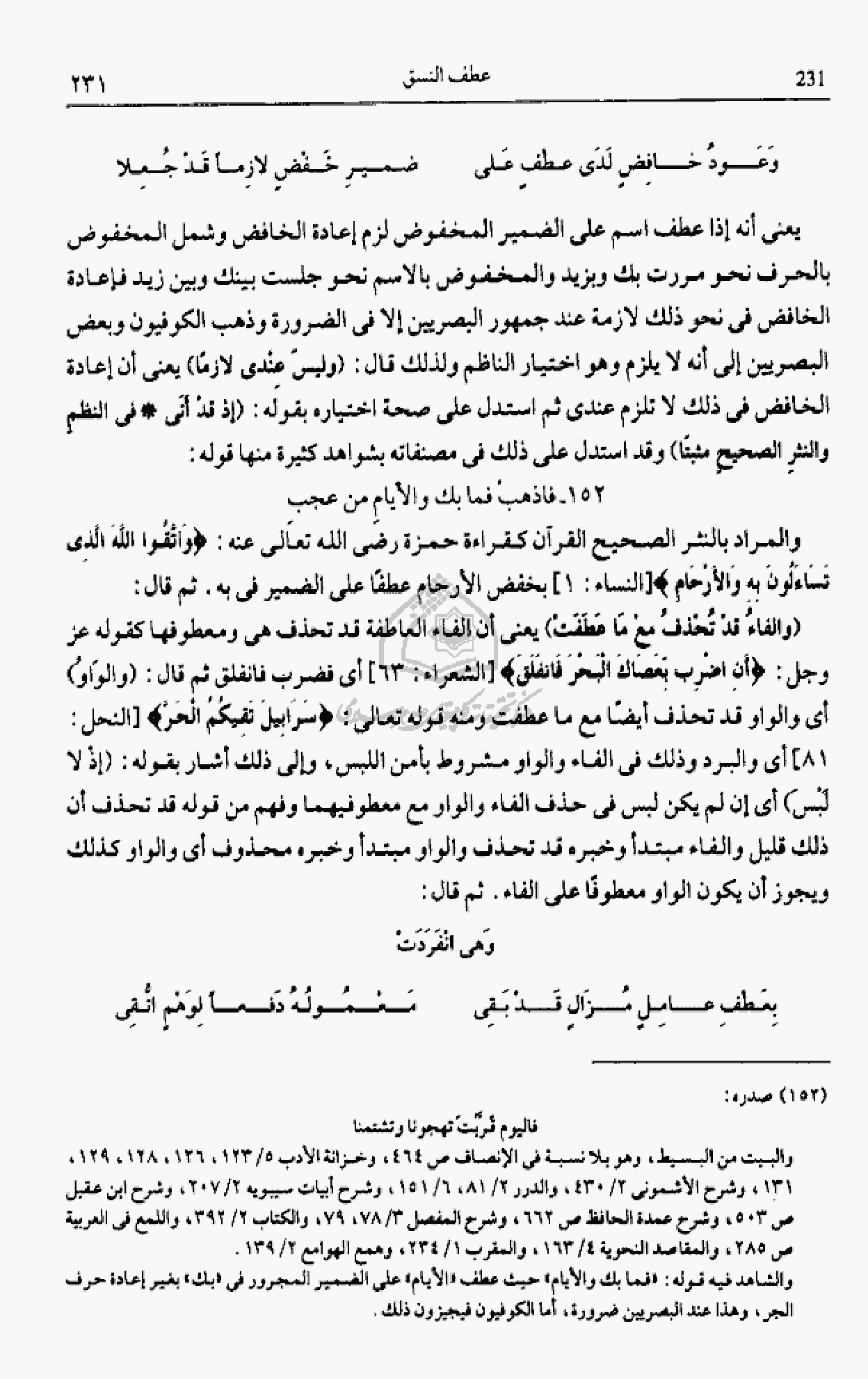 يعنى أنه إذا عطف اسم على الضمير المخفوض لزم إعادة الخافض وشمل المخفوض بالحرف نحو مررت بك وبزيد والمخفوض بالاسم نحو جلست بينك وبين زيد فإعادة الخافض فى نحو ذلك لازمة عند جمهور البصريين إلا فى الضرورة وذهب الكوفيون وبعض البصريين إلى أنه لا يلزم وهو اختيار الناظم ولذلك قال: (وليس عندى لازما) يعنى أن إعادة الخافض فى ذلك لا تلزم عندى ثم استدل على صحة اختياره بقوله: (إذ قد أتى * فى النظم والنثر الصحيح مثبتا) وقد استدل على ذلك فى مصنفاته بشواهد كثيرة منها قوله: