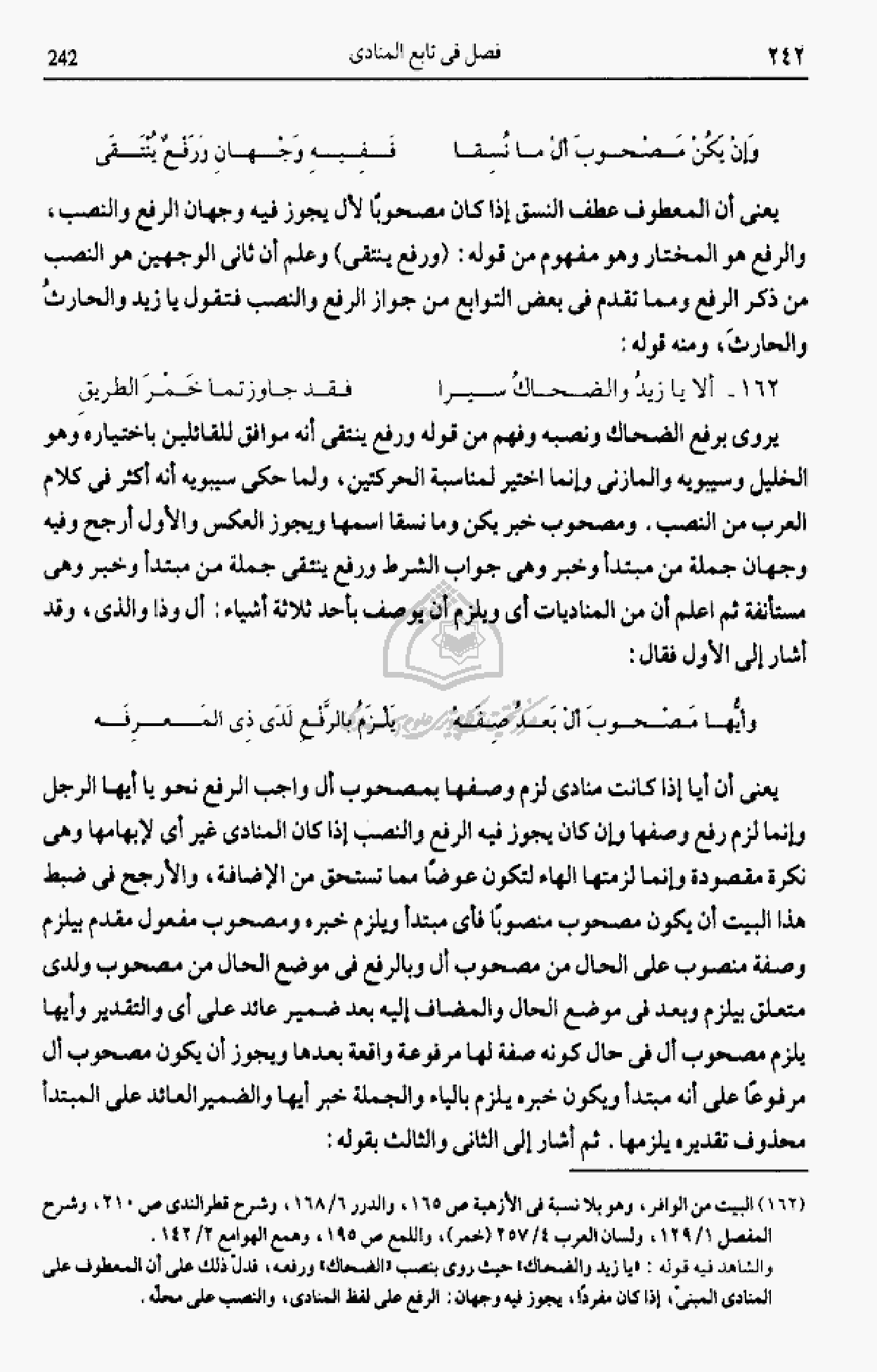 والشاهد فيه قوله: «يا زيد والضحاك» حيث روى بنصب «الضحاك» ورفعه، فدلّ ذلك على أن المعطوف على المنادى المبنىّ، إذا كان مفردا، يجوز فيه وجهان: الرفع على لفظ المنادى، والنصب على محلّه.