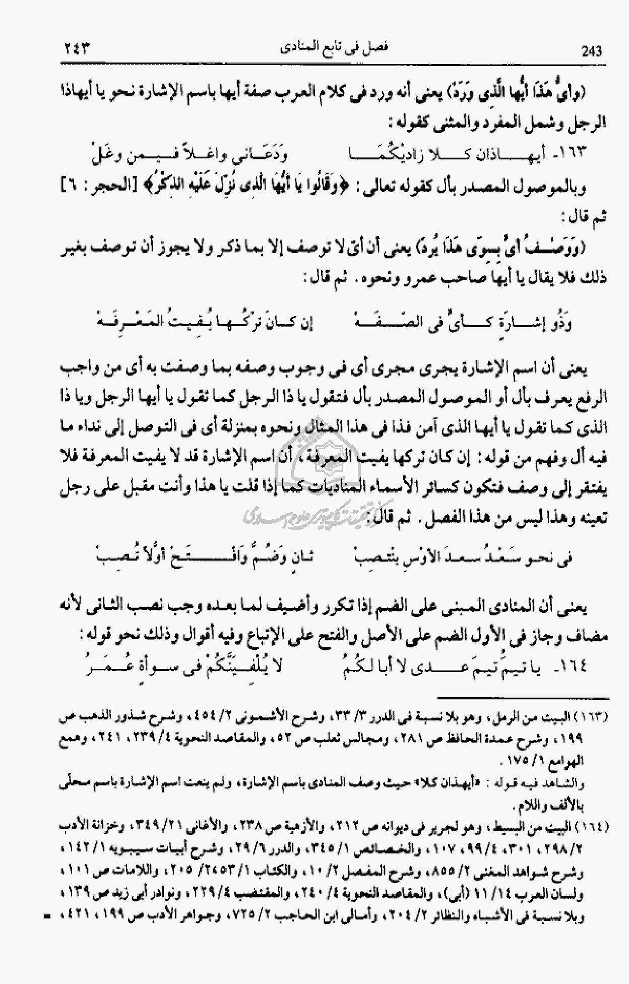 والشاهد فيه قوله: «أيهذان كلا» حيث وصف المنادى باسم الإشارة، ولم ينعت اسم الإشارة باسم محلّى بالألف واللام.