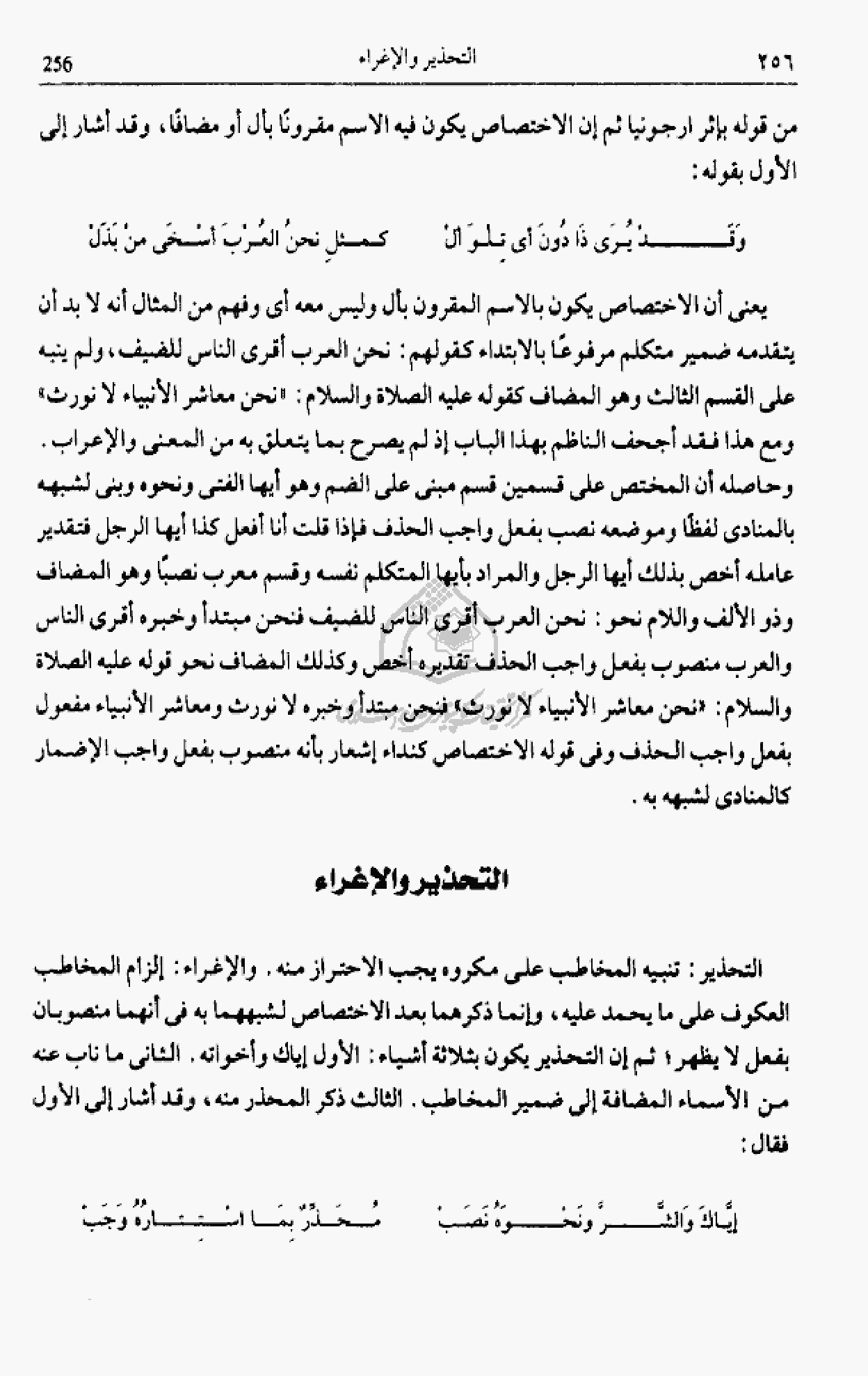 التحذير: تنبيه المخاطب على مكروه يجب الاحتراز منه. والإغراء: إلزام المخاطب العكوف على ما يحمد عليه، وإنما ذكرهما بعد الاختصاص لشبههما به فى أنهما منصوبان بفعل لا يظهر؛ ثم إن التحذير يكون بثلاثة أشياء: الأول إياك وأخواته. الثانى ما ناب عنه من الأسماء المضافة إلى ضمير المخاطب. الثالث ذكر المحذر منه، وقد أشار إلى الأول فقال: