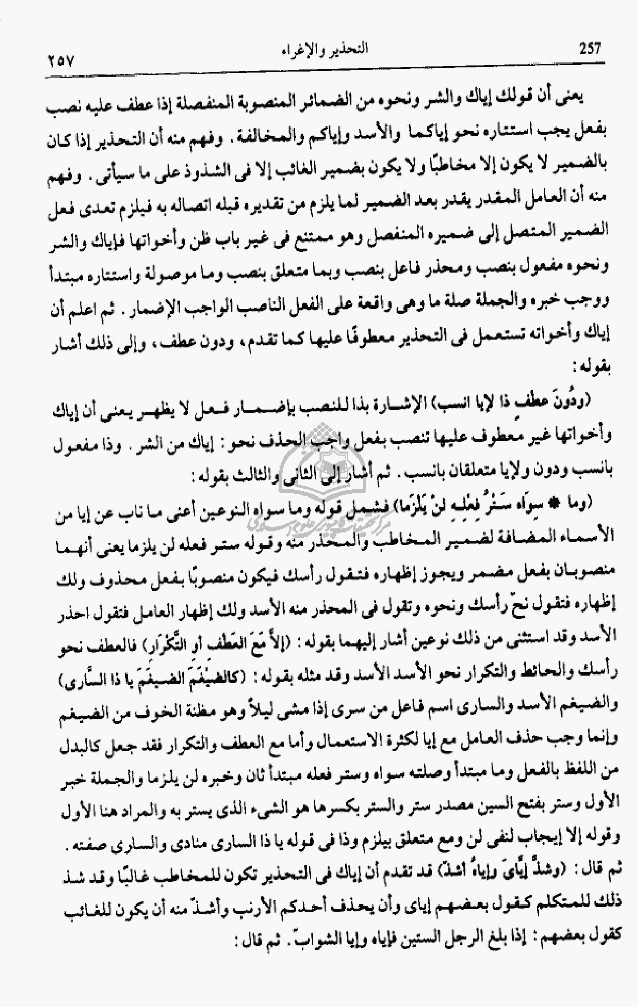 المخاطب والمحذر منه وقوله ستر فعله لن يلزما يعنى أنهما منصوبان بفعل مضمر ويجوز إظهاره فتقول رأسك فيكون منصوبا بفعل محذوف ولك إظهاره فتقول نحّ رأسك ونحوه وتقول فى المحذر منه الأسد ولك إظهار العامل فتقول احذر الأسد وقد استثنى من ذلك نوعين أشار إليهما بقوله: (إلّا مع العطف أو التّكرار) فالعطف نحو رأسك والحائط والتكرار نحو الأسد الأسد وقد مثله بقوله: (كالضيغم الضيغم يا ذا السّارى) والضيغم الأسد والسارى اسم فاعل من سرى إذا مشى ليلا وهو مظنة الخوف من الضيغم وإنما وجب حذف العامل مع إيا لكثرة الاستعمال وأما مع العطف والتكرار فقد جعل كالبدل من اللفظ بالفعل وما مبتدأ وصلته سواه وستر فعله مبتدأ ثان وخبره لن يلزما والجملة خبر الأول وستر بفتح السين مصدر ستر والستر بكسرها هو الشئ الذى يستر به والمراد هنا الأول وقوله إلا إيجاب لنفى لن ومع متعلق بيلزم وذا فى قوله يا ذا السارى منادى والسارى صفته.