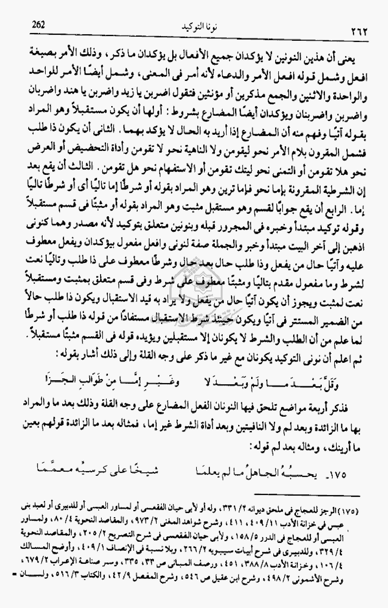 يعنى أن هذين النونين لا يؤكدان جميع الأفعال بل يؤكدان ما ذكر، وذلك الأمر بصيغة افعل وشمل قوله افعل الأمر والدعاء لأنه أمر فى المعنى، وشمل أيضا الأمر للواحد والواحدة والاثنين والجمع مذكرين أو مؤنثين فتقول اضربن يا زيد واضربن يا هند واضربان واضربن واضربنان ويؤكدان أيضا المضارع بشروط: أولها أن يكون مستقبلا وهو المراد بقوله آتيا وفهم منه أن المضارع إذا أريد به الحال لا يؤكد بهما. الثانى أن يكون ذا طلب فشمل المقرون بلام الأمر نحو ليقومن ولا الناهية نحو لا تقومن وأداة التحضيض أو العرض نحو هلا تقومن أو التمنى نحو ليتك تقومن أو الاستفهام نحو هل تقومن. الثالث أن يقع بعد إن الشرطية المقرونة بإما نحو فإما ترين وهو المراد بقوله أو شرطا إما تاليا أى أو شرطا تاليا إما. الرابع أن يقع جوابا لقسم وهو مستقبل مثبت وهو المراد بقوله أو مثبتا فى قسم مستقبلا وقوله توكيد مبتدأ وخبره فى المجرور قبله وبنونين متعلق بتوكيد لأنه مصدر وهما كنونى اذهبن إلى آخر البيت مبتدأ وخبر والجملة صفة لنونى وافعل مفعول بيؤكدان ويفعل معطوف عليه وآتيا حال من يفعل وذا طلب حال بعد حال وشرطا معطوف على ذا طلب وتاليا نعت لشرط وما مفعول مقدم بتاليا ومثبتا معطوف على شرط وفى قسم متعلق بمثبت ومستقبلا نعت لمثبت ويجوز أن يكون آتيا حال من يفعل ولا يراد به قيد الاستقبال ويكون ذا طلب حالا من الضمير المستتر فى آتيا ويكون حينئذ شرط الاستقبال مستفادا من قوله ذا طلب أو شرطا لما علم من أن الطلب والشرط لا يكونان إلا مستقبلين ويؤيده قوله فى القسم مثبتا مستقبلا.