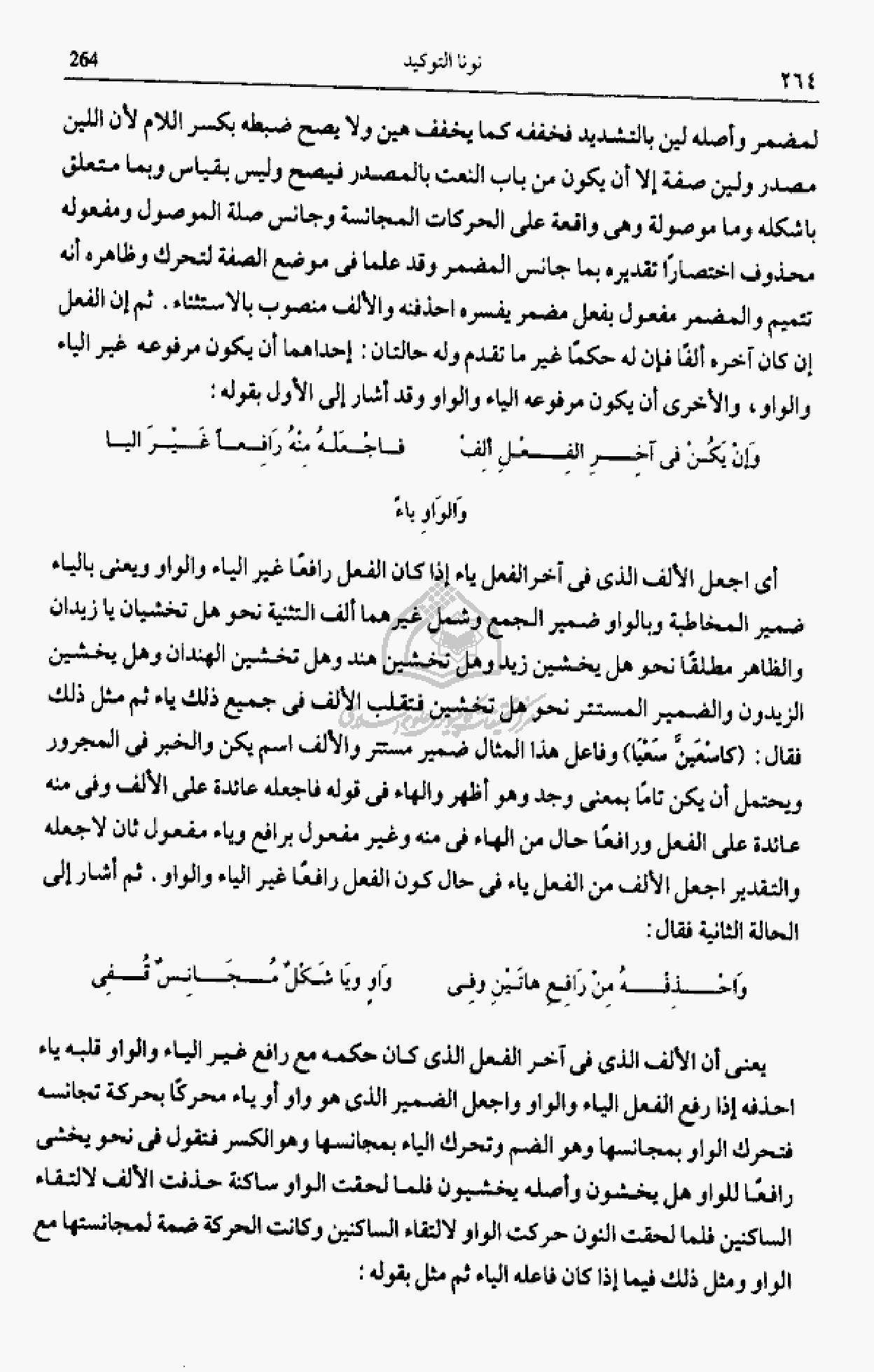 أى اجعل الألف الذى فى آخر الفعل ياء إذا كان الفعل رافعا غير الياء والواو ويعنى بالياء ضمير المخاطبة وبالواو ضمير الجمع وشمل غيرهما ألف التثنية نحو هل تخشيان يا زيدان والظاهر مطلقا نحو هل يخشين زيد وهل تخشين هند وهل تخشين الهندان وهل يخشين الزيدون والضمير المستتر نحو هل تخشين فتقلب الألف فى جميع ذلك ياء ثم مثل ذلك فقال: (كاسعينّ سعيا) وفاعل هذا المثال ضمير مستتر والألف اسم يكن والخبر فى المجرور ويحتمل أن يكن تاما بمعنى وجد وهو أظهر والهاء فى قوله فاجعله عائدة على الألف وفى منه عائدة على الفعل ورافعا حال من الهاء فى منه وغير مفعول برافع وياء مفعول ثان لاجعله والتقدير اجعل الألف من الفعل ياء فى حال كون الفعل رافعا غير الياء والواو. ثم أشار إلى الحالة الثانية فقال: