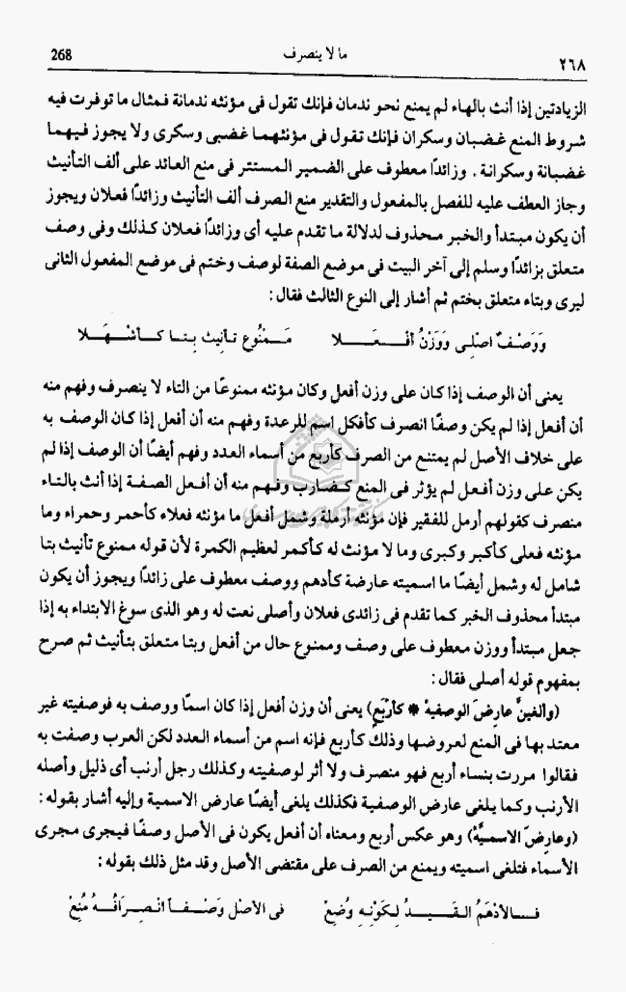 الزيادتين إذا أنث بالهاء لم يمنع نحو ندمان فإنك تقول فى مؤنثه ندمانة فمثال ما توفرت فيه شروط المنع غضبان وسكران فإنك تقول فى مؤنثهما غضبى وسكرى ولا يجوز فيهما غضبانة وسكرانة. وزائدا معطوف على الضمير المستتر فى منع العائد على ألف التأنيث وجاز العطف عليه للفصل بالمفعول والتقدير منع الصرف ألف التأنيث وزائدا فعلان ويجوز أن يكون مبتدأ والخبر محذوف لدلالة ما تقدم عليه أى وزائدا فعلان كذلك وفى وصف متعلق بزائدا وسلم إلى آخر البيت فى موضع الصفة لوصف وختم فى موضع المفعول الثانى ليرى وبتاء متعلق بختم ثم أشار إلى النوع الثالث فقال: