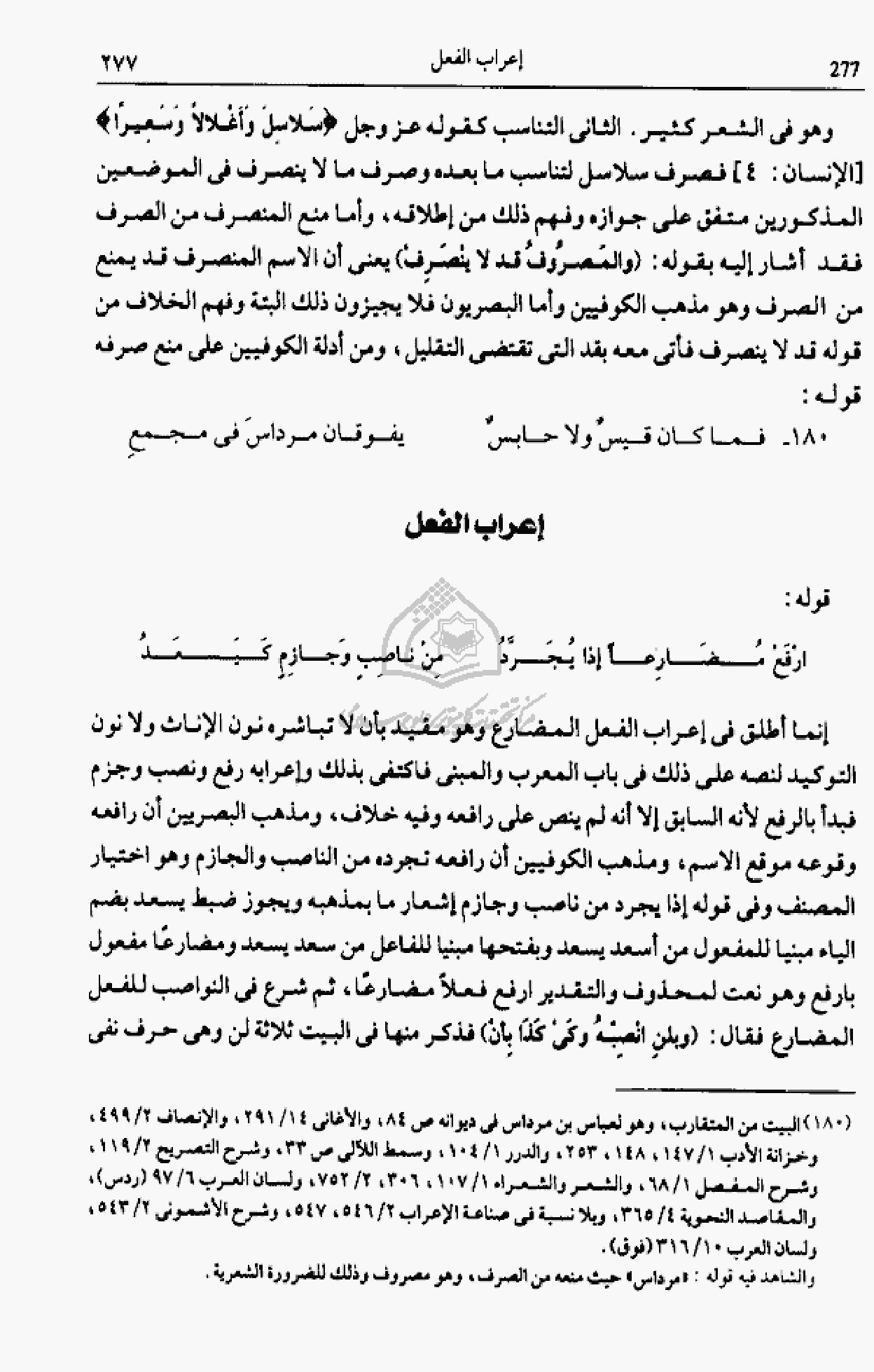 وهو فى الشعر كثير. الثانى التناسب كقوله عز وجل سَلاسِلَ وَأَغْلالًا وَسَعِيراً [الإنسان: 4] فصرف سلاسل لتناسب ما بعده وصرف ما لا ينصرف فى الموضعين المذكورين متفق على جوازه وفهم ذلك من إطلاقه، وأما منع المنصرف من الصرف فقد أشار إليه بقوله: (والمصروف قد لا ينصرف) يعنى أن الاسم المنصرف قد يمنع من الصرف وهو مذهب الكوفيين وأما البصريون فلا يجيزون ذلك البتة وفهم الخلاف من قوله قد لا ينصرف فأتى معه بقد التى تقتضى التقليل، ومن أدلة الكوفيين على منع صرفه قوله: