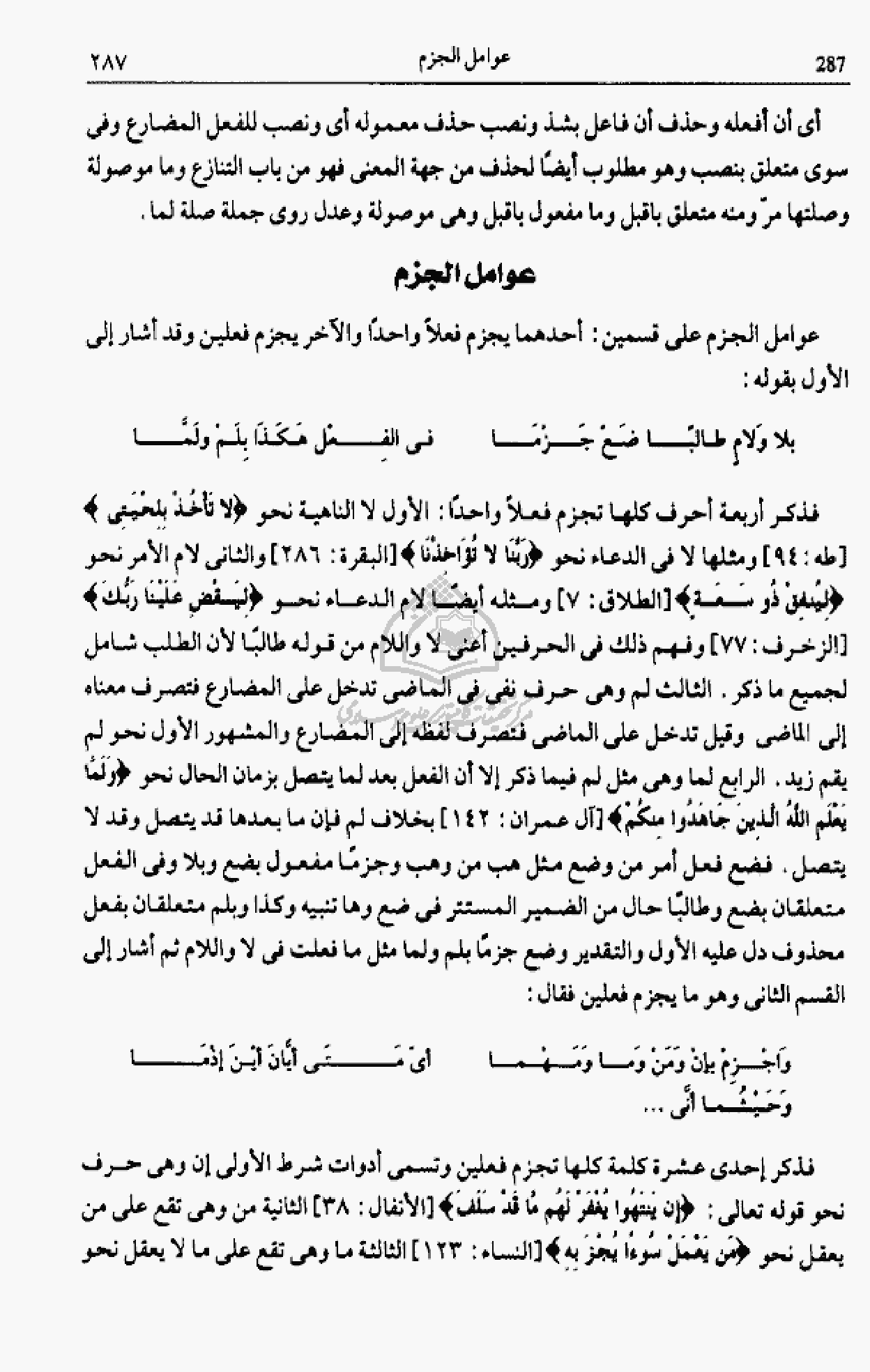 فذكر أربعة أحرف كلها تجزم فعلا واحدا: الأول لا الناهية نحو لا تَأْخُذْ بِلِحْيَتِي [طه: 94] ومثلها لا فى الدعاء نحو رَبَّنا لا تُؤاخِذْنا [البقرة: 286] والثانى لام الأمر نحو لِيُنْفِقْ ذُو سَعَةٍ [الطلاق: 7] ومثله أيضا لام الدعاء نحو لِيَقْضِ عَلَيْنا رَبُّكَ [الزخرف: 77] وفهم ذلك فى الحرفين أعنى لا واللام من قوله طالبا لأن الطلب شامل لجميع ما ذكر. الثالث لم وهى حرف نفى فى الماضى تدخل على المضارع فتصرف معناه إلى الماضى وقيل تدخل على الماضى فتصرف لفظه إلى المضارع والمشهور الأول نحو لم يقم زيد. الرابع لما وهى مثل لم فيما ذكر إلا أن الفعل بعد لما يتصل بزمان الحال نحو وَلَمَّا يَعْلَمِ اللَّهُ الَّذِينَ جاهَدُوا مِنْكُمْ [آل عمران: 142] بخلاف لم فإن ما بعدها قد يتصل وقد لا يتصل. فضع فعل أمر من وضع مثل هب من وهب وجزما مفعول بضع وبلا وفى الفعل متعلقان بضع وطالبا حال من الضمير المستتر فى ضع وها تنبيه وكذا وبلم متعلقان بفعل محذوف دل عليه الأول والتقدير وضع جزما بلم ولما مثل ما فعلت فى لا واللام ثم أشار إلى القسم الثانى وهو ما يجزم فعلين فقال: