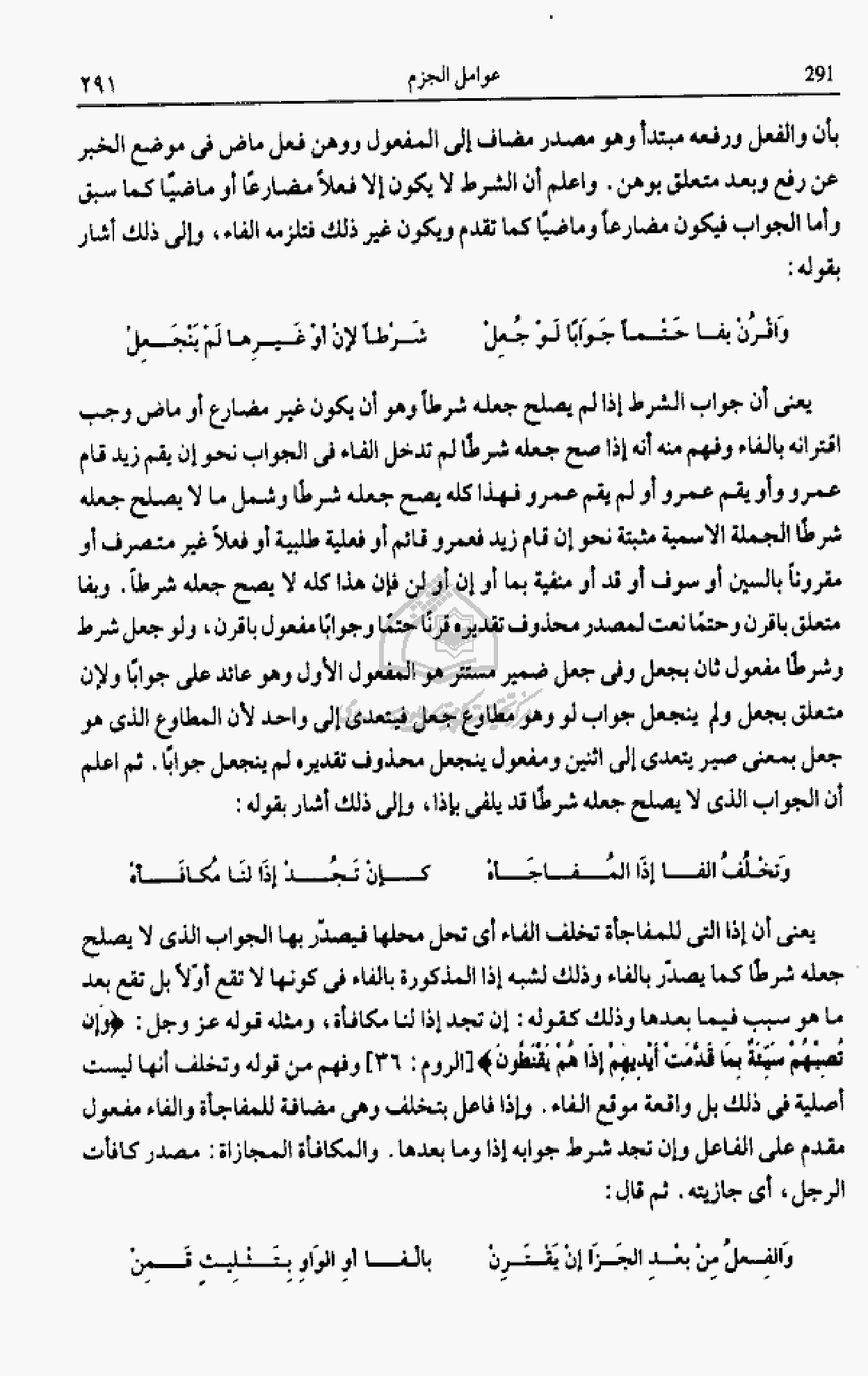 يعنى أن جواب الشرط إذا لم يصلح جعله شرطا وهو أن يكون غير مضارع أو ماض وجب اقترانه بالفاء وفهم منه أنه إذا صح جعله شرطا لم تدخل الفاء فى الجواب نحو إن يقم زيد قام عمرو وأو يقم عمرو أو لم يقم عمرو فهذا كله يصح جعله شرطا وشمل ما لا يصلح جعله شرطا الجملة الاسمية مثبتة نحو إن قام زيد فعمرو قائم أو فعلية طلبية أو فعلا غير متصرف أو مقرونا بالسين أو سوف أو قد أو منفية بما أو إن أو لن فإن هذا كله لا يصح جعله شرطا. وبفا متعلق باقرن وحتما نعت لمصدر محذوف تقديره قرنا حتما وجوابا مفعول باقرن، ولو جعل شرط وشرطا مفعول ثان بجعل وفى جعل ضمير مستتر هو المفعول الأول وهو عائد على جوابا ولإن متعلق بجعل ولم ينجعل جواب لو وهو مطاوع جعل فيتعدى إلى واحد لأن المطاوع الذى هو جعل بمعنى صير يتعدى إلى اثنين ومفعول ينجعل محذوف تقديره لم ينجعل جوابا. ثم اعلم أن الجواب الذى لا يصلح جعله شرطا قد يلفى بإذا، وإلى ذلك أشار بقوله: