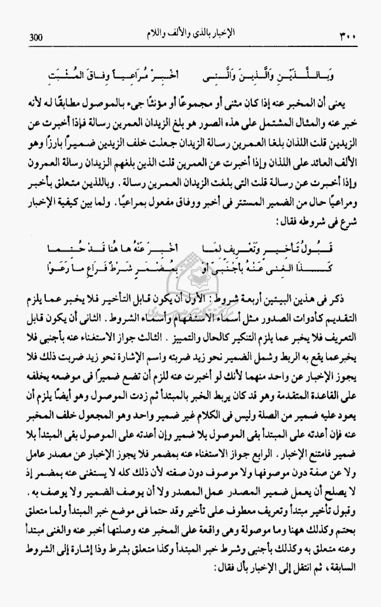 يعنى أن المخبر عنه إذا كان مثنى أو مجموعا أو مؤنثا جئ بالموصول مطابقا له لأنه خبر عنه والمثال المشتمل على هذه الصور هو بلغ الزيدان العمرين رسالة فإذا أخبرت عن الزيدين قلت اللذان بلغا العمرين رسالة الزيدان جعلت خلف الزيدين ضميرا بارزا وهو الألف العائد على اللذان وإذا أخبرت عن العمرين قلت الذين بلغهم الزيدان رسالة العمرون وإذا أخبرت عن رسالة قلت التى بلغت الزيدان العمرين رسالة. وباللذين متعلق بأخبر ومراعيا حال من الضمير المستتر فى أخبر ووفاق مفعول بمراعيا. ولما بين كيفية الإخبار شرع فى شروطه فقال: