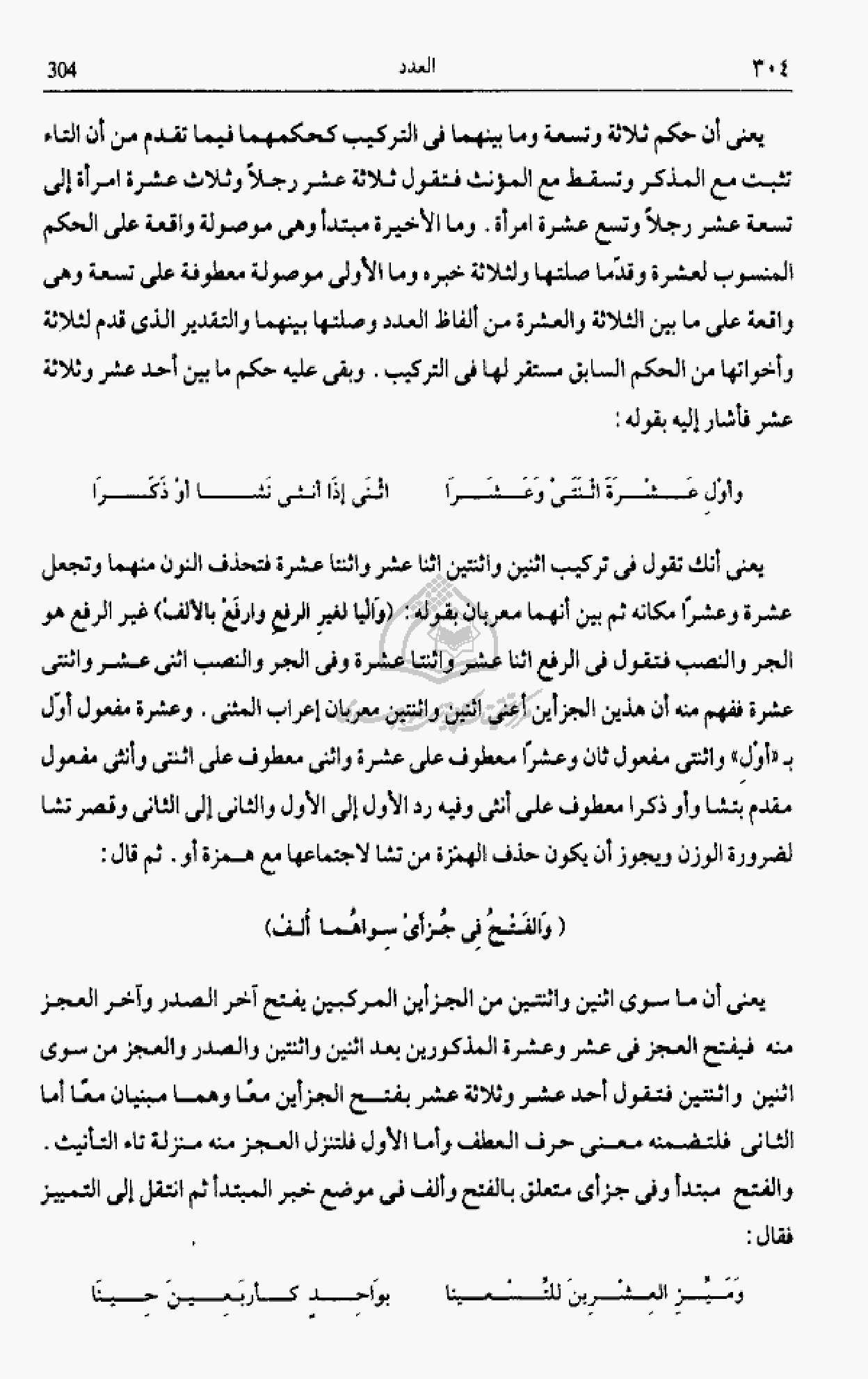 وعشرة المذكورين بعد اثنين واثنتين والصدر والعجز من سوى اثنين واثنتين فتقول أحد عشر وثلاثة عشر بفتح الجزأين معا وهما مبنيان معا أما الثانى فلتضمنه معنى حرف العطف وأما الأول فلتنزل العجز منه منزلة تاء التأنيث.