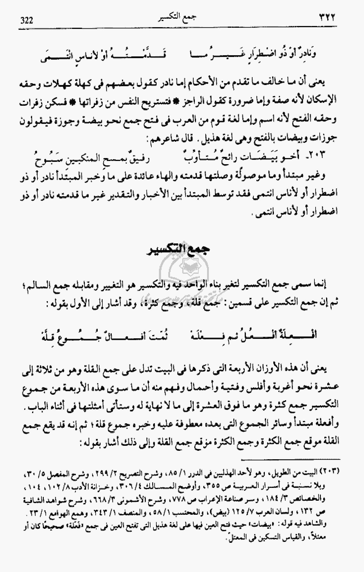 يعنى أن هذه الأوزان الأربعة التى ذكرها فى البيت تدل على جمع القلة وهو من ثلاثة إلى عشرة نحو أغربة وأفلس وفتية وأحمال وفهم منه أن ما سوى هذه الأربعة من جموع التكسير جمع كثرة وهو ما فوق العشرة إلى ما لا نهاية له وستأتى أمثلتها فى أثناء الباب.