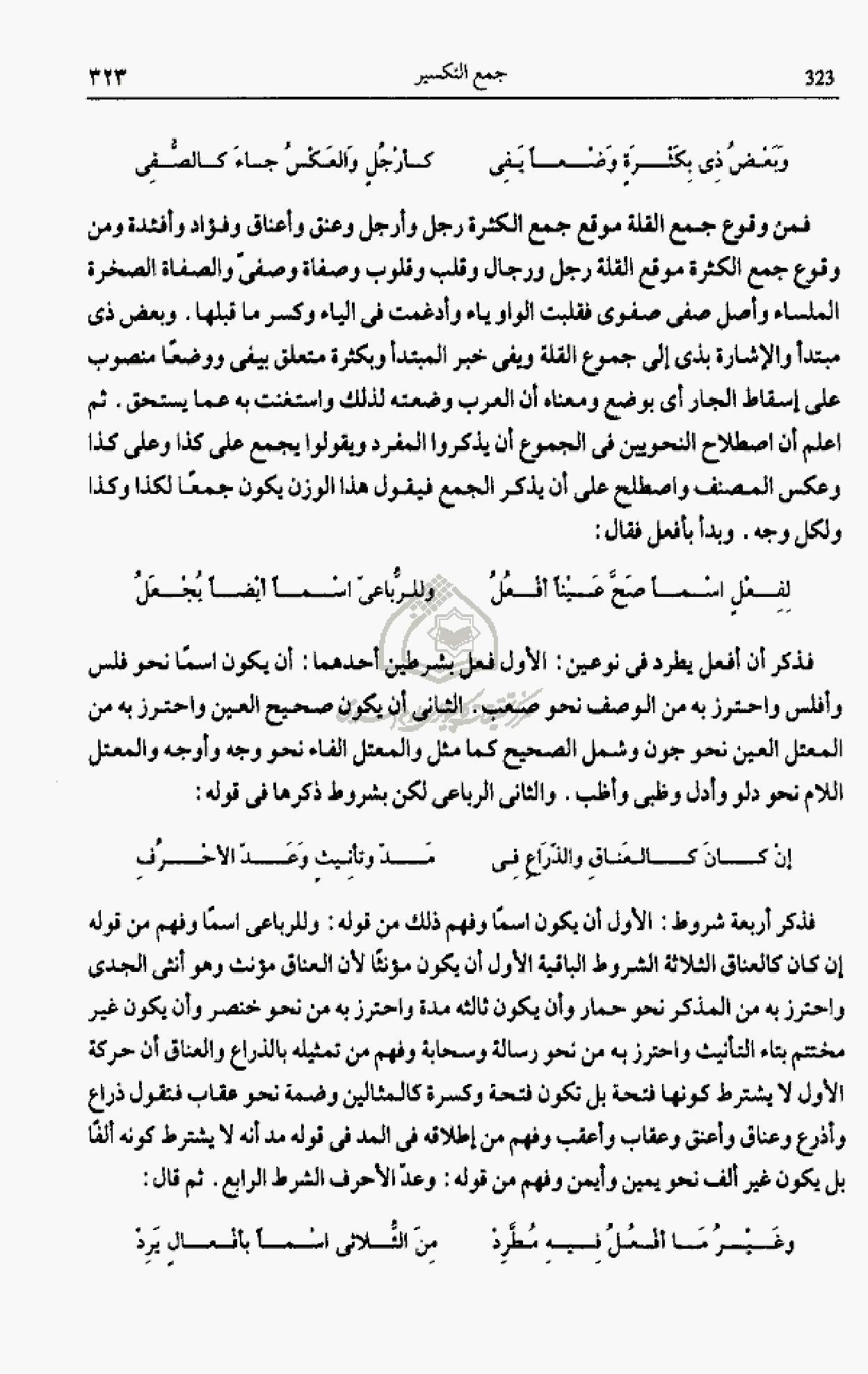 وأن يكون ثالثه مدة واحترز به من نحو خنصر وأن يكون غير مختتم بتاء التأنيث واحترز به من نحو رسالة وسحابة وفهم من تمثيله بالذراع والعناق أن حركة الأول لا يشترط كونها فتحة بل تكون فتحة وكسرة كالمثالين وضمة نحو عقاب فتقول ذراع وأذرع وعناق وأعنق وعقاب وأعقب وفهم من إطلاقه فى المد فى قوله مد أنه لا يشترط كونه ألفا بل يكون غير ألف نحو يمين وأيمن وفهم من قوله: وعدّ الأحرف الشرط الرابع. ثم قال: