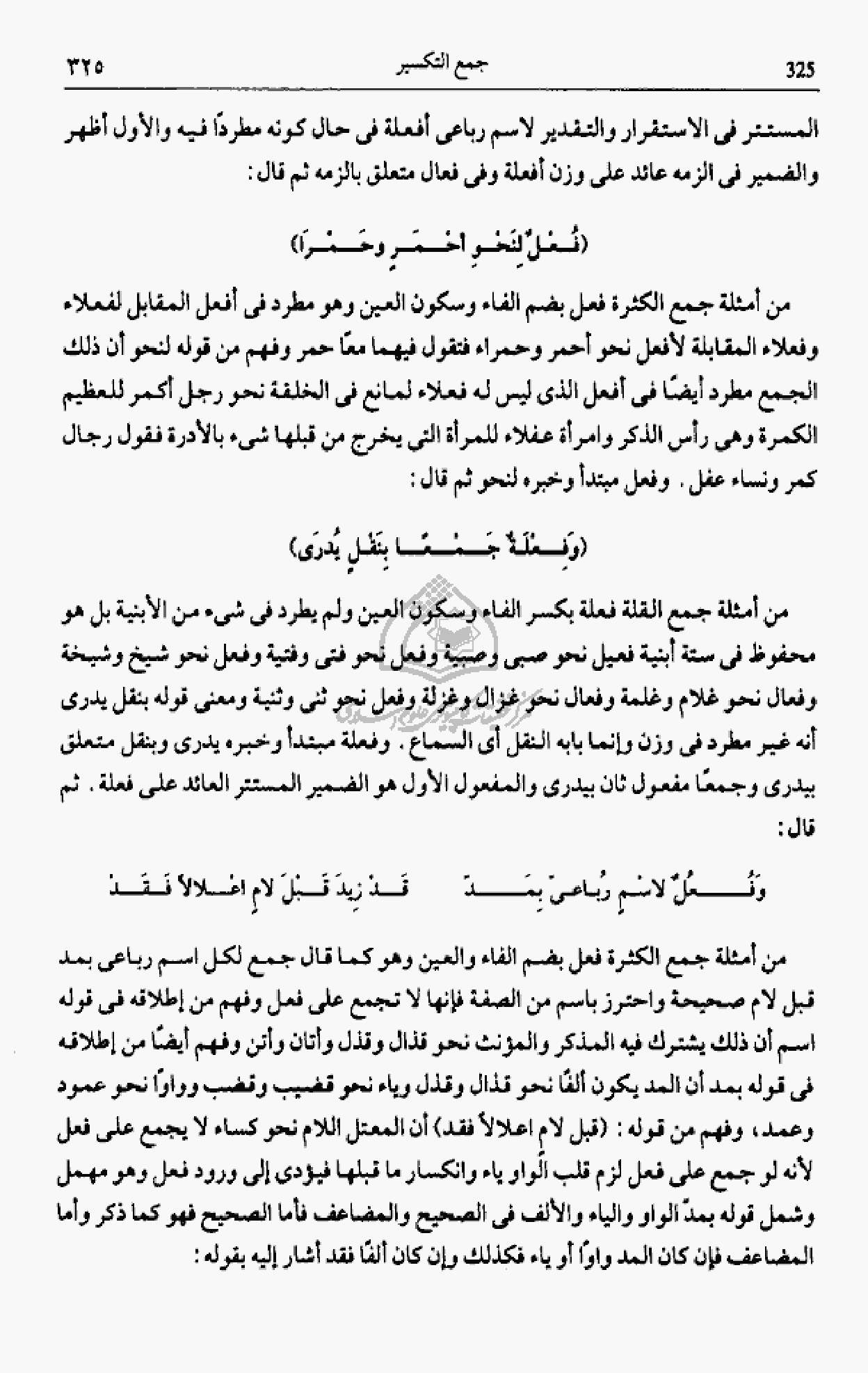 من أمثلة جمع الكثرة فعل بضم الفاء وسكون العين وهو مطرد فى أفعل المقابل لفعلاء وفعلاء المقابلة لأفعل نحو أحمر وحمراء فتقول فيهما معا حمر وفهم من قوله لنحو أن ذلك الجمع مطرد أيضا فى أفعل الذى ليس له فعلاء لمانع فى الخلقة نحو رجل أكمر للعظيم الكمرة وهى رأس الذكر وامرأة عفلاء للمرأة التى يخرج من قبلها شئ بالأدرة فقول رجال كمر ونساء عفل. وفعل مبتدأ وخبره لنحو ثم قال: