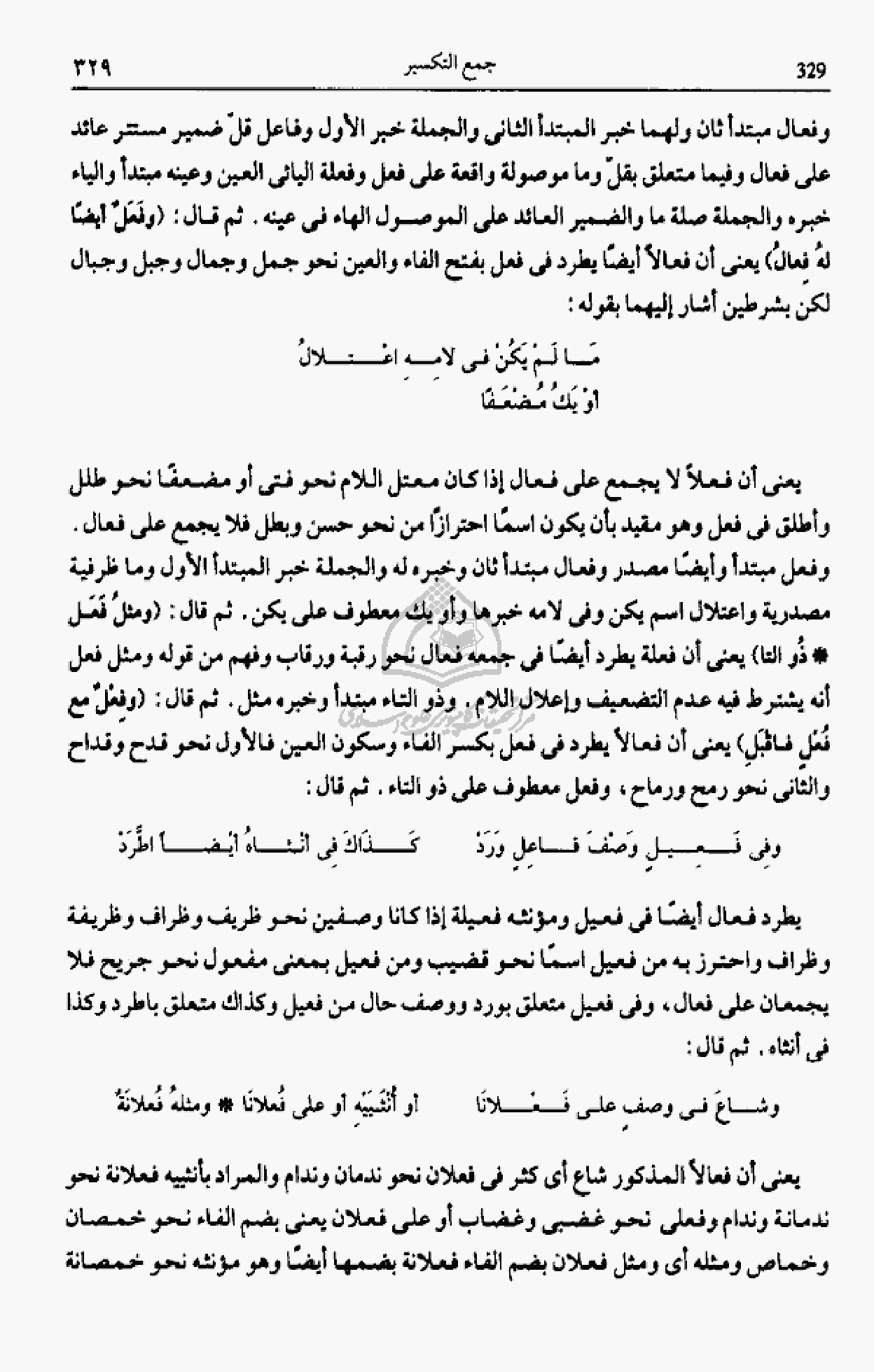 يطرد فعال أيضا فى فعيل ومؤنثه فعيلة إذا كانا وصفين نحو ظريف وظراف وظريفة وظراف واحترز به من فعيل اسما نحو قضيب ومن فعيل بمعنى مفعول نحو جريح فلا يجمعان على فعال، وفى فعيل متعلق بورد ووصف حال من فعيل وكذاك متعلق باطرد وكذا فى أنثاه. ثم قال: